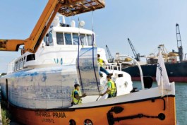 O Trafaria Praia, o cacilheiro transformado em obra de arte, já está na água. Chega a Veneza a 20 de Maio.