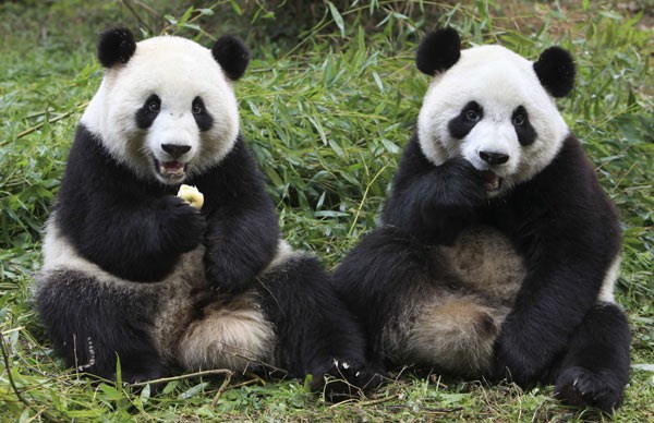 Os pandas Qiqi (à esquerda) e Zhizhi comem uma refeição no Centro de Investigação sobre Reprodução de Pandas Gigantes em Chengdu, na província de Sichuan. Em Janeiro, a China vai começar a enviar pandas criados em cativeiro para uma zona selvagem controlada no Sul daquela província, com 780 hectares. Foto: China Daily/Reuters