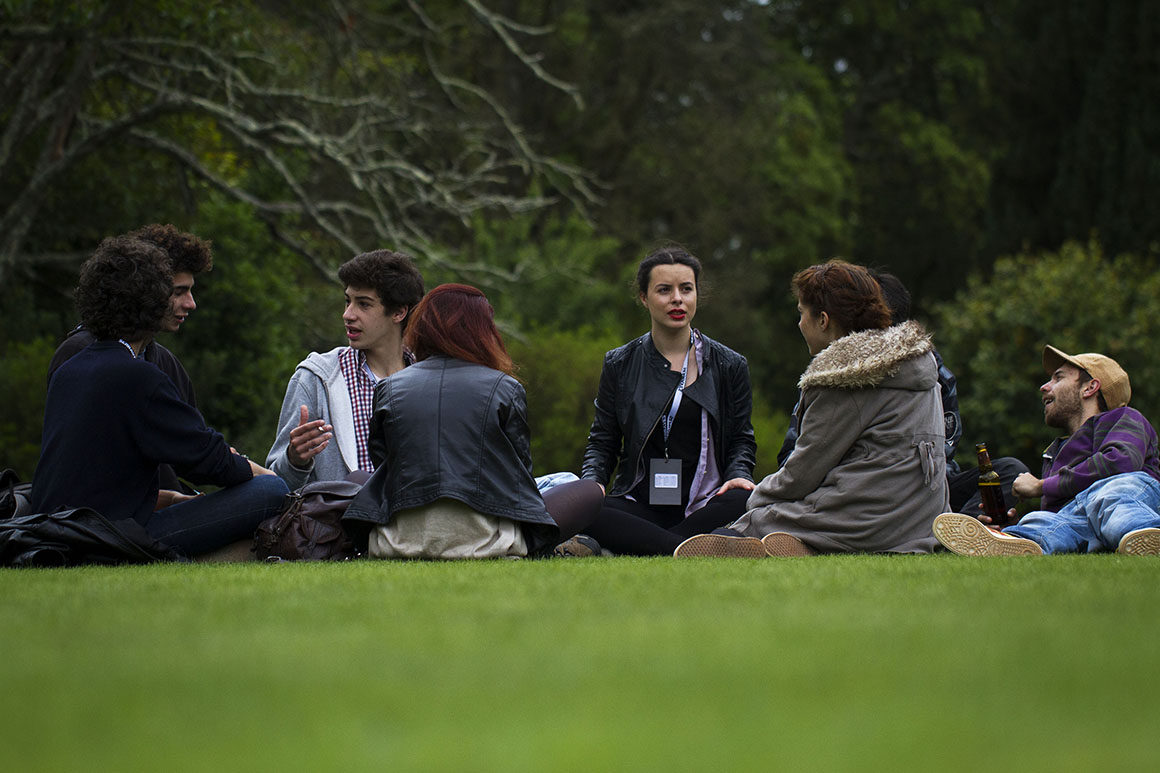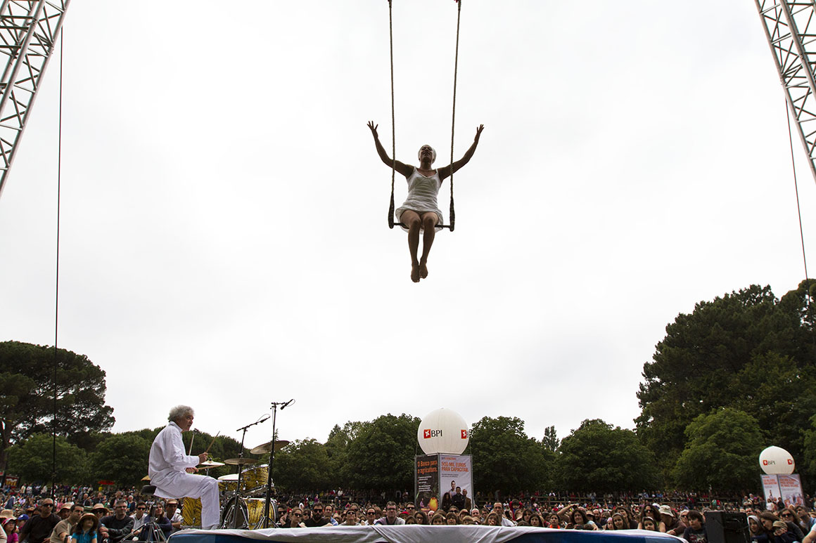 Há uma trapezista suspensa no prado de Serralves a reagir aos sons criados por um baterista: ora deita-se no trapézio, ora trepa-o, ora gira sobre ele. À frente deles, membros da companhia francesa Jo Bithume, juntam-se centenas de pessoas que se sentam, sem medo, na relva do prado para ver este espectáculo de circo contemporâneo, Traz Fusion. Podem agradecer ao sol que apareceu ao início da tarde de ontem e deu novo ânimo ao Serralves em Festa, no Porto.