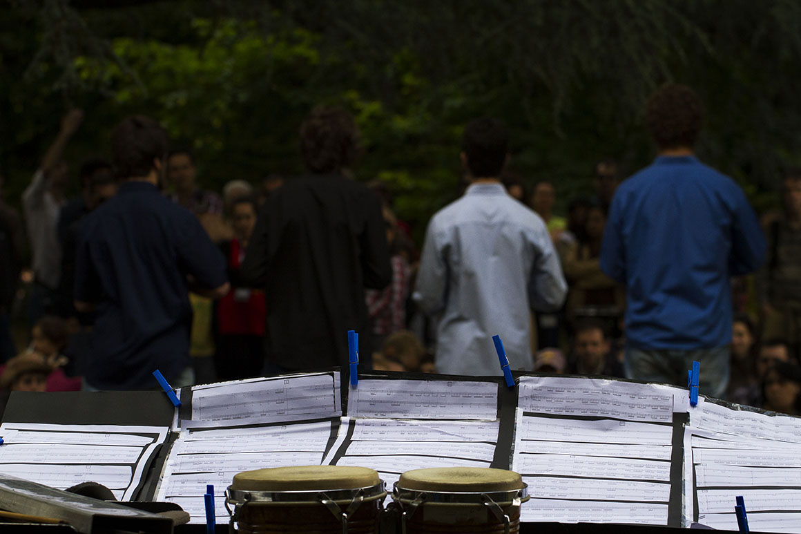 Pouco depois, fez-se fila para entrar na Casa de Serralves. "O que é música experimental?", ouvimos perguntar, enquanto esperávamos. Dentro da casa seria dada uma das várias respostas possíveis: a sueca Hanna Hartman e quatro músicos portugueses faziam música com objectos do dia-a-dia, resultado de um workshop de três dias. Atrás deles, lá fora, uma agitação (bailarinos a correr, o povo atrás deles), silenciada pelos grandes vidros da casa; dentro da casa, só texturas, detalhes, sons vindos de um aquário, brinquedos, instrumentos inventados. E uma pequena audiência, sentada no chão.