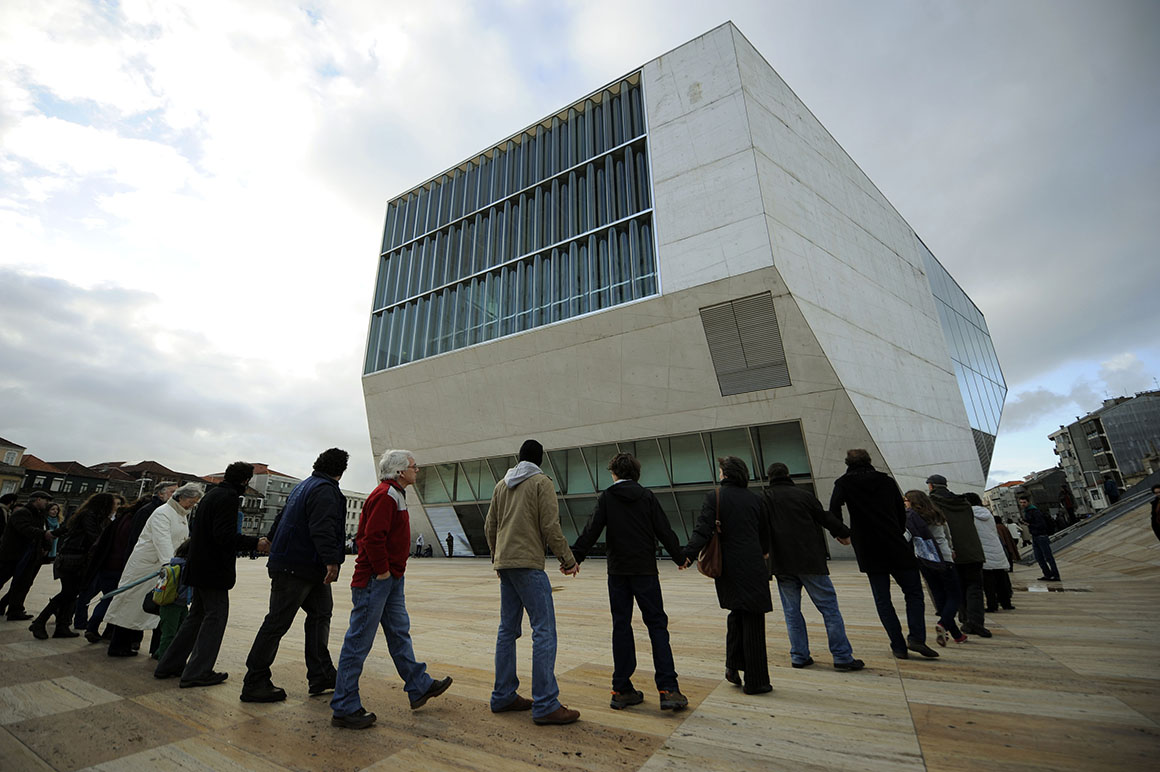 Um domingo à tarde na praça da Casa da Música não costuma ser isto: um enorme cordão humano em torno do “meteorito” de Rem Koolhaas, num protesto de centenas de pessoas (250, nas contas da PSP) contra os cortes de 30% ao financiamento público da instituição.