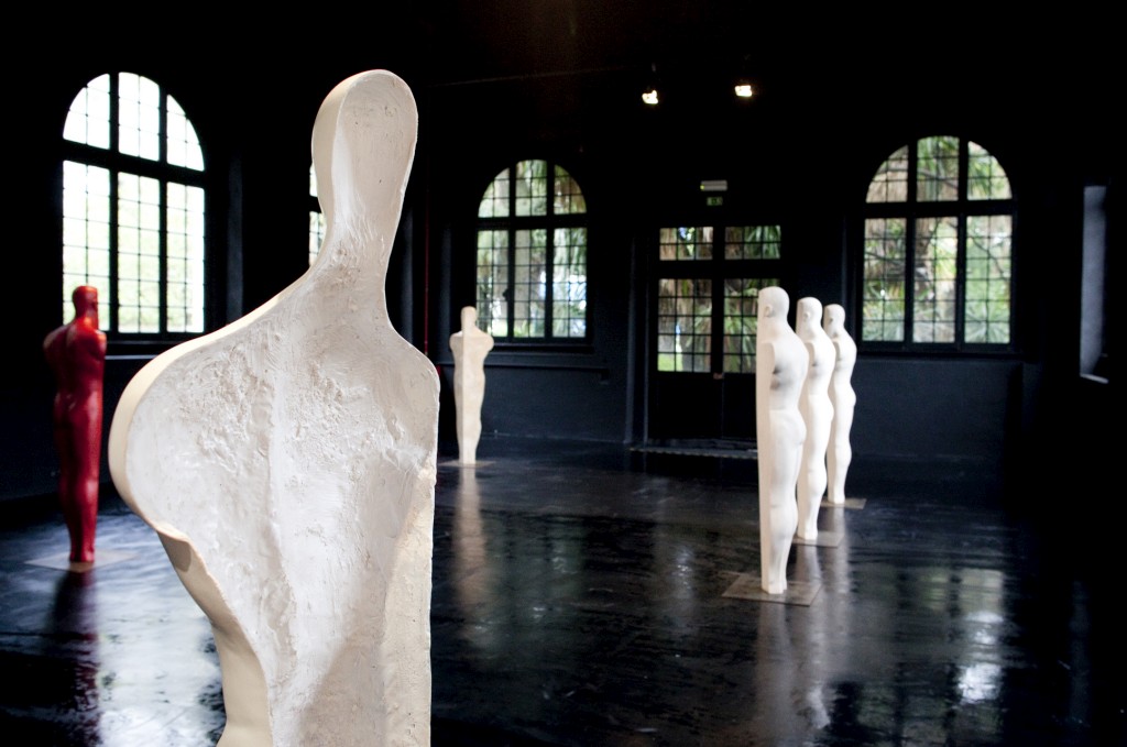 Na pintura, e também na escultura de pequenos e médios formatos de Sérgio Pombo, as mulheres são mais habituais. São presenças normalmente fragmentadas – uma parte de rosto emoldurada por uma mecha de cabelo esvoaçante, uns joelhos a continuar para as coxas que se perdem no interior de uma mini-saia ínfima… São figuras pop, coloridas, variadas. Os homens são de outra têmpera. Quando surgem, são como aqueles que temos agora à frente – atléticos e fortes, uns quase portentos, quase clássicos, não fora também eles serem um corte do humano, sempre incompletos, não propriamente indivíduos, mas, antes, imagens.