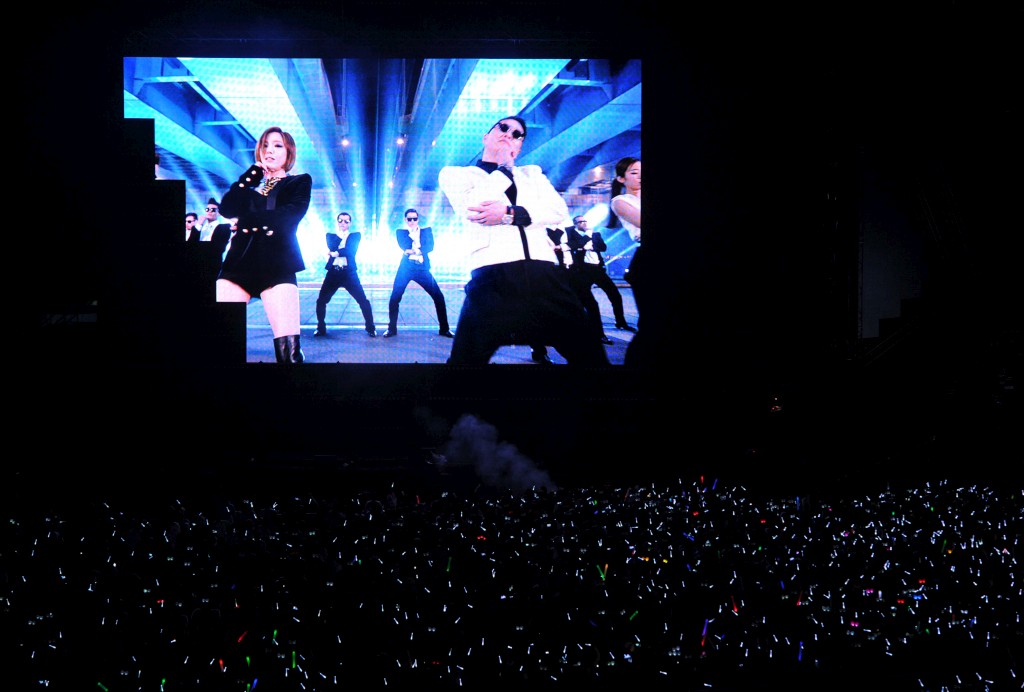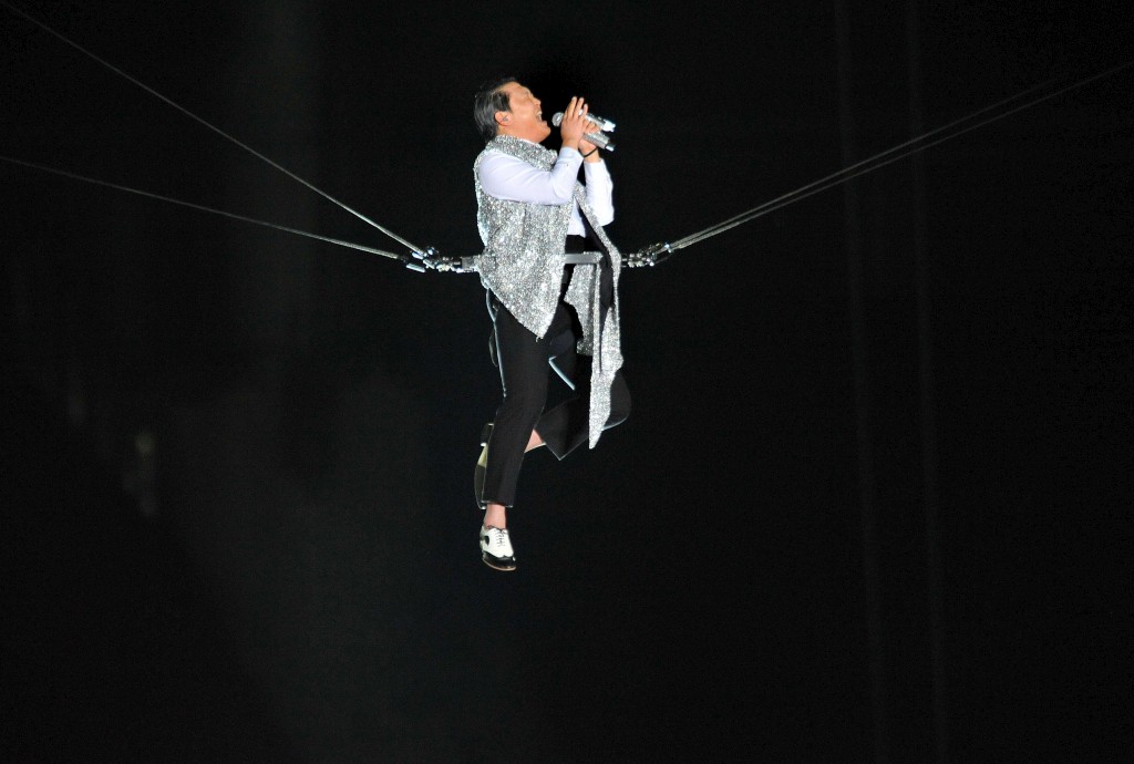 Há chamas a soltarem-se da plateia, às vezes um pequeno fogo-de-artificio, raios laser, confetti. Psy salta, transpira, dá lugar a outras estrelas coreanas - actuaram as 2Ne1 e o rapper G-Dragon -, volta renovado. Dedica um tema a Beyoncé, quase despido, provando que quer mesmo fazer as pessoas rir. Atravessa o público voando por cima dele, pendurado com cabos de um lado ao outro. Há-de aterrar de pé em cima de um piano colocado antes das bancadas do estádio, onde uma jovem pianista se mantém impecavelmente concentrada. Vai voar outra vez. Em segundos o piano já não está lá. Psy voltará ao palco, voltará a lançar-se pelo ar, vai mostrar-se emocionado e arrancar uma salva de berros com isso.