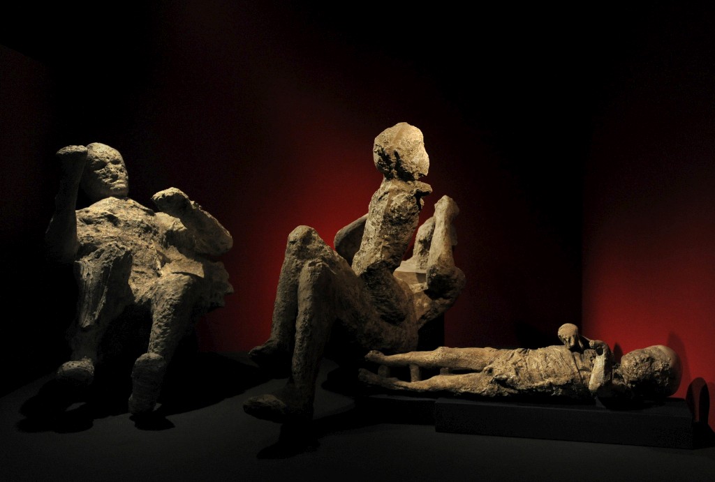 Uma pintura de parede retratando um casal – o marido identificado como o padeiro Terentius Neo; uma bracelete de ouro em forma de cobra; um berço de bebé em madeira carbonizada; meia dúzia de outras peças de mobiliário; relevos em mármore representando cenas da vida real e da mitologia romana... Mas também os cadáveres de uma família (os pais e duas crianças) sob as escadas de sua casa numa posição em que se adivinha o pânico pela aproximação da morte; o cadáver de uma mulher em que se vêem ainda os ossos; ou a icónica “escultura viva” de um cão contorcendo-se de dor...