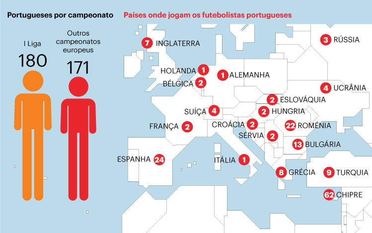 Uma análise mais detalhada ao destino dos portugueses mostra, por outro lado, que as razões financeiras serão as que mais pesam na hora de decidir pela emigração. É que o maior contingente joga em Chipre (62), que está longe de ser um campeonato de topo. Segue-se a Liga espanhola (24) e os campeonatos romeno (22) e búlgaro (13), outros dois de segunda linha.