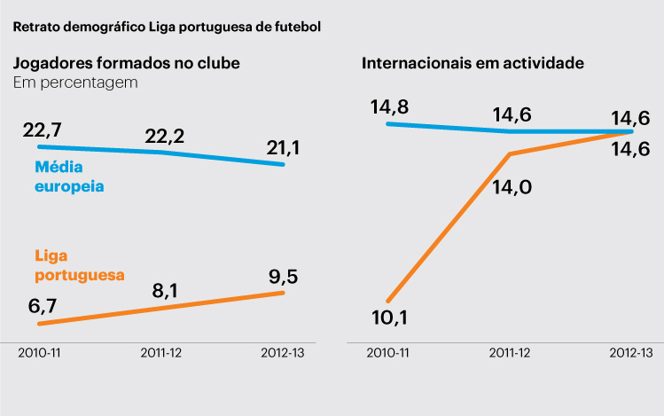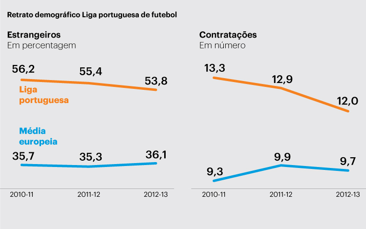 A emigração das principais figuras do futebol português – e cada vez mais, também, de jogadores de equipas médias – deixa, por outro lado, mais espaço para os estrangeiros na Liga portuguesa, que continua a ser a terceira com maior percentagem de futebolistas oriundos de outros países (53,8%), apenas atrás de Chipre (74,2%) e Inglaterra (55,1%).