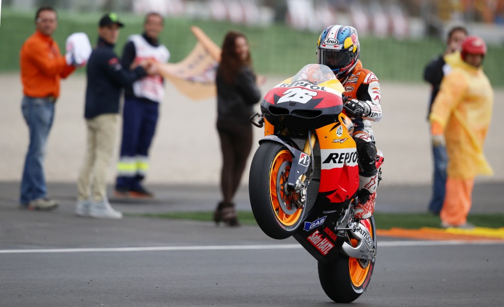 O espanhol Dani Pedrosa venceu este domingo o Grande Premio Comunidade Valenciana de MotoGP, a 18.ª e última etapa do Mundial, marcada pela queda do campeão do mundo, Jorge Lorenzo, e pele despedida do australiano Casey Stoner.