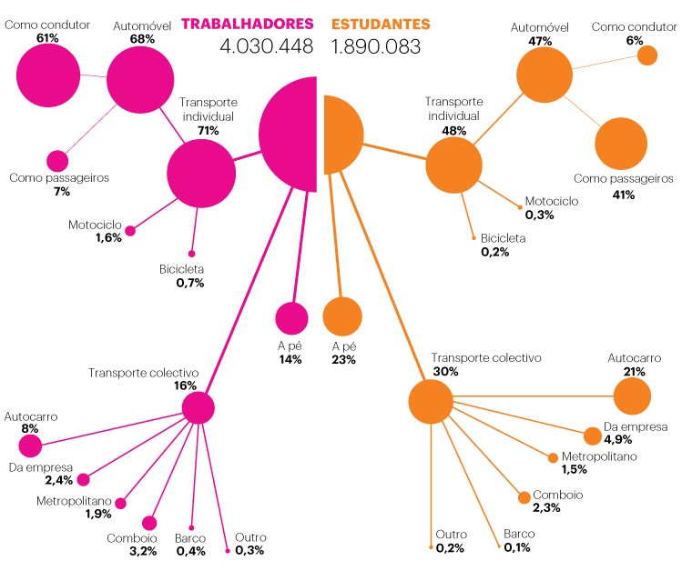 Cálculos que levam em conta os modos de transporte, as quantidades de CO2 que cada um liberta e os tempos médios das deslocações (ver metodologia na infografia) sugerem que sempre que os trabalhadores e os estudantes do país saem de casa, cerca de 6.100.000 quilos de CO2 são libertados. Contando com o regresso, os chamados movimentos pendulares - que não incluem uma série de outras deslocações urbanas, nem camiões, táxis, carros de serviço, aviões ou navios - representam quase um quarto (24%) das emissões dos transportes em Portugal.