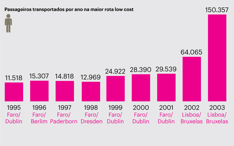 Quando a primeira transportadora aérea low cost aterrou nos aeroportos nacionais, em 1995, a maior rota movimentava apenas 11.500 passageiros por ano, entre Faro e Dublin.