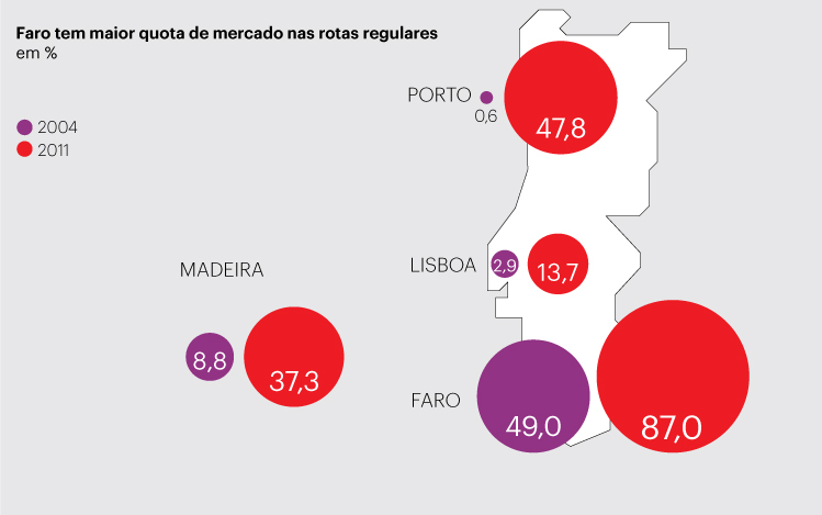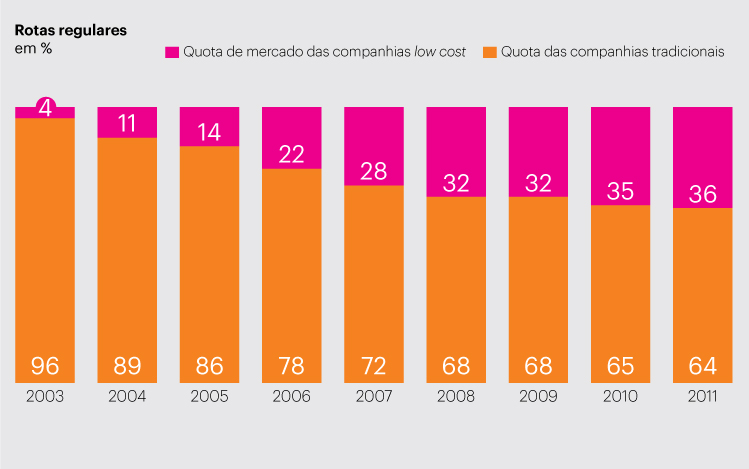 Mas, à medida que o modelo de negócio se foi instalando no país e atraindo cada vez mais consumidores de viagens, estas empresas começaram a ganhar terreno às companhias tradicionais como a TAP e chegaram a 2011 com uma quota de mercado de 36%, que compara com os tímidos 4% de 2003.
