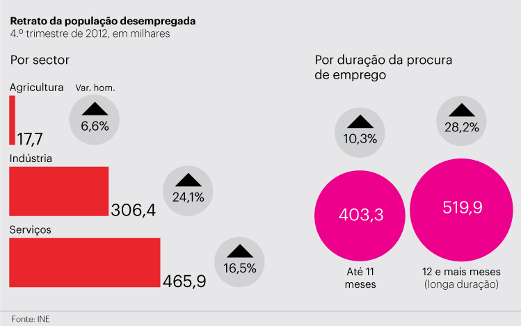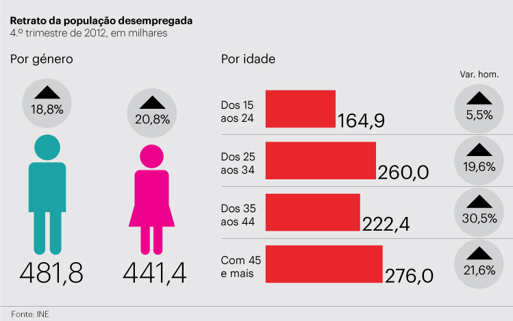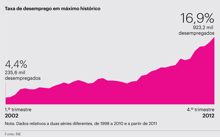 Os números divulgados esta quarta-feira pelo Instituto Nacional de Estatística (INE) revelam que a taxa de desemprego pulou para os 16,9% no último trimestre de 2012, valor que compara com os 14% apurados no final de 2011.