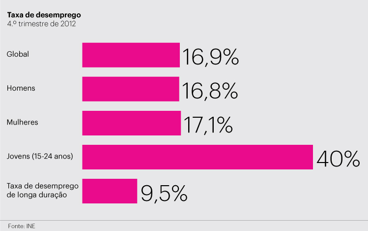 No último trimestre de 2012, a redução do emprego ocorreu sobretudo na construção, indústria e energia (com uma redução de 12,8%), mas também no sector dos serviços (onde a quebra foi de 1,9%), com destaque para as actividades financeiras e a administração pública. Agricultura, produção animal e pescas foram os sectores onde se criou algum emprego (a população empregada aumentou 3,3%).