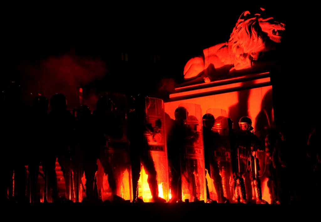 18h35 Foi ateado um fogo numa rua próxima do Parlamento. As imagens televisivas mostram chamas muito próximas de carros estacionados.