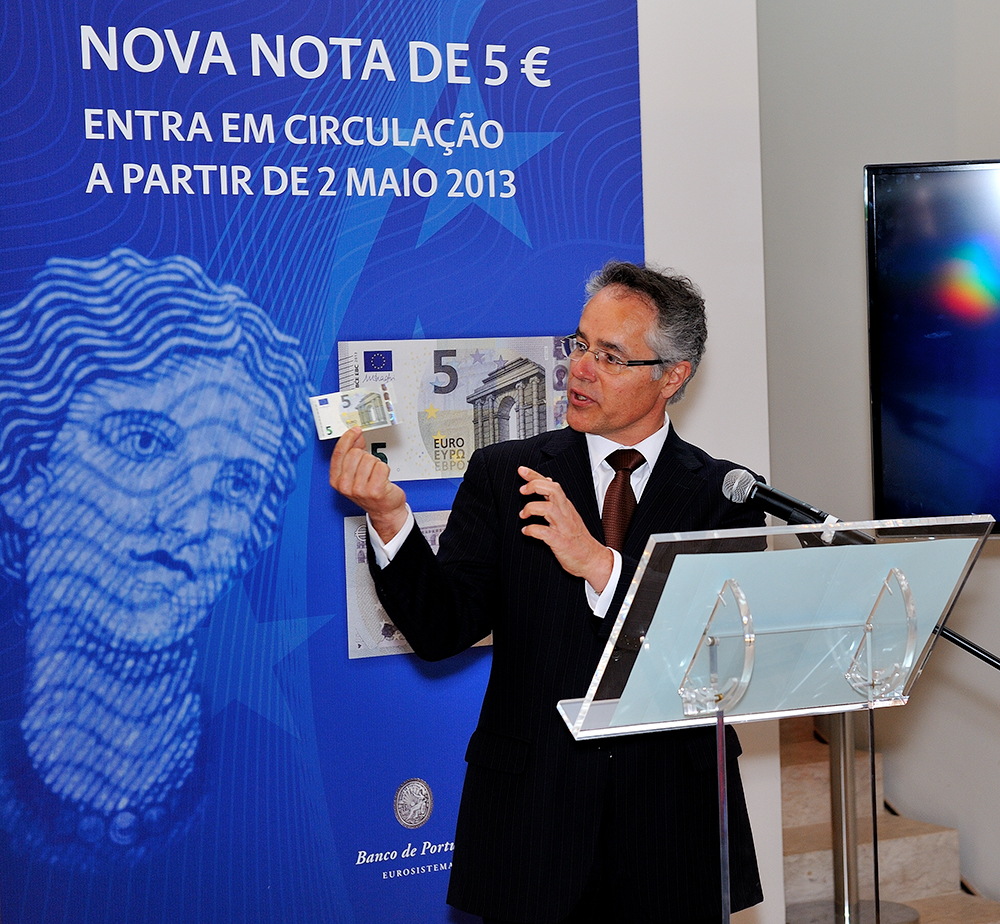 A nova nota de cinco euros, que entrará em circulação na quinta-feira, foi apresentada nesta segunda-feira por Carlos Costa. O governador do Banco de Portugal garante que a nova nota "proporciona mais segurança" ao combater a contrafacção. A nova nota tem vinte elementos de segurança, muitos dos quais não estão à vista.