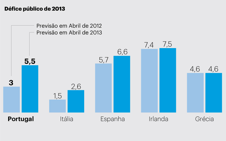 Em 2012, o falhanço de Portugal nos objectivos do défice também foi maior do que o dos seus parceiros da periferia. O valor final calculado pelo INE e Eurostat foi de 6,4%, após diversas correcções aos dados inicialmente reportados pelas Finanças. Há um ano, a troika apontava para 4,5%.