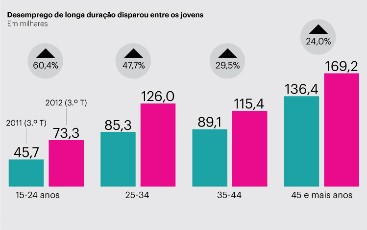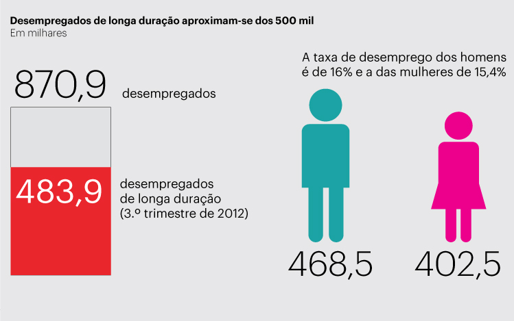 O número de pessoas desempregadas há mais de um ano aumentou 35,8% no terceiro trimestre de 2012 (face ao mesmo período do ano anterior). Dos 870.900 desempregados, 55,6% estavam à procura de emprego há 12 meses ou mais (8,8% da população activa).