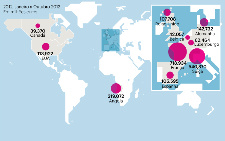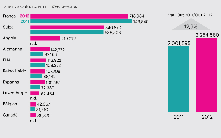 Emigrantes em países como Espanha, Angola, Alemanha ou Reino Unido enviaram mais dinheiro em dez meses de 2012 do que em todo o ano de 2011. Entre os países no topo, Angola foi dos que tiveram a maior subida: mais quase 50% em dez meses, quando comparado com todo o ano de 2011, subindo de cerca de 147 milhões para cerca de 219 milhões euros (não há dados discriminados por meses em relação a Angola).