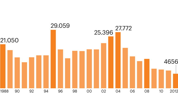 Houve uma redução de 27% em relação ao ano anterior, em que o abate de árvores tinha também chegado a um recorde mínimo, 6418 quilómetros quadrados.