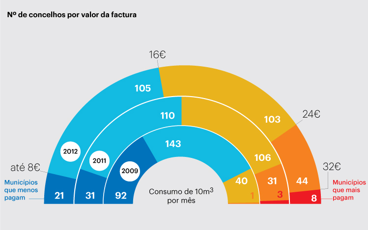 Os portugueses pagaram, em média, mais 8% na factura da água, saneamento e tratamento de lixo em 2012 do que no ano anterior. Dados da Entidade Reguladora dos Serviços de Águas e Resíduos (ERSAR) mostram que a maioria dos concelhos continua a aumentar os preços, mas esta evolução é vista como positiva, por aproximar as tarifas dos serviços ao que os mesmos realmente custam aos cofres das autarquias.