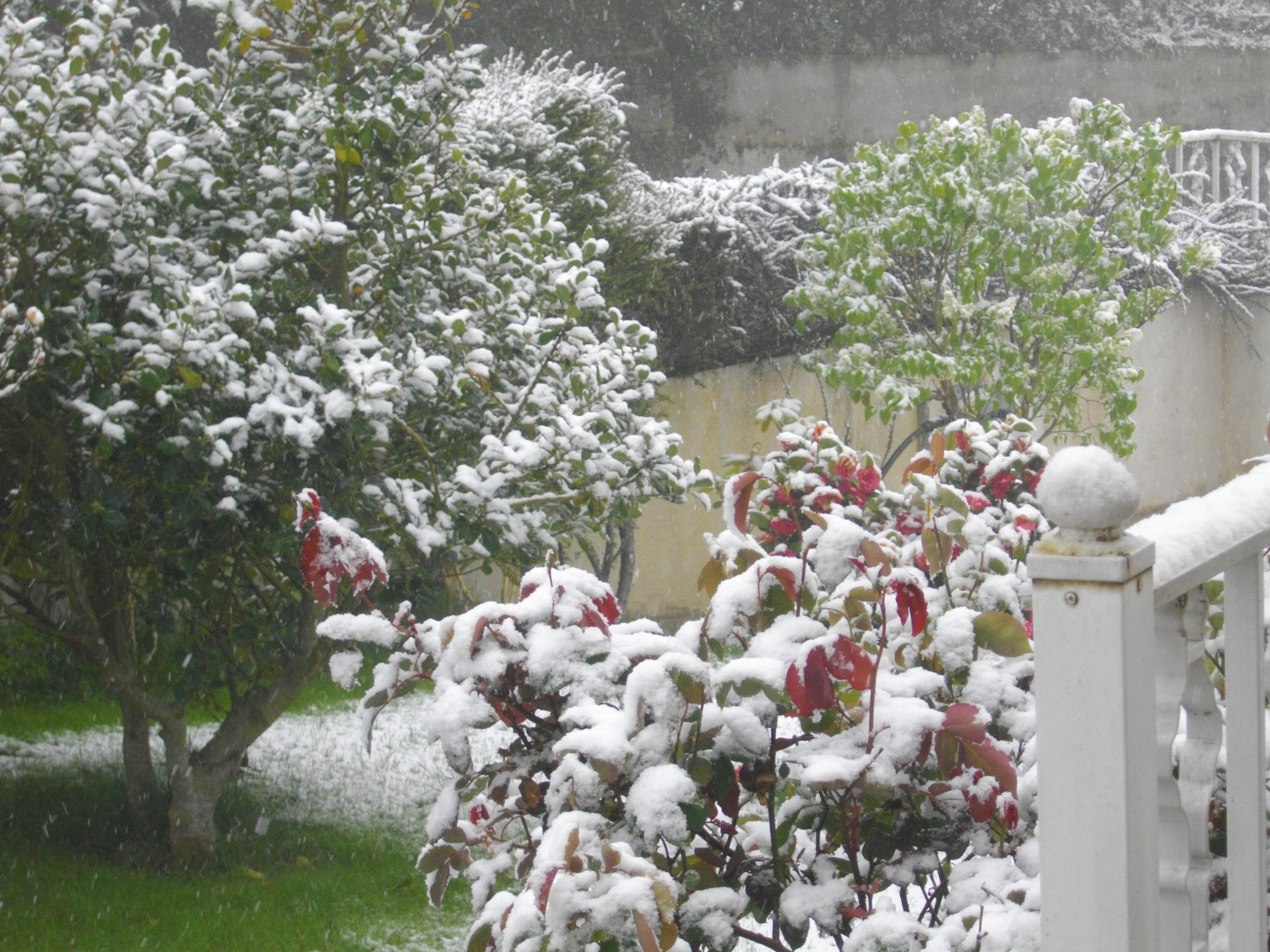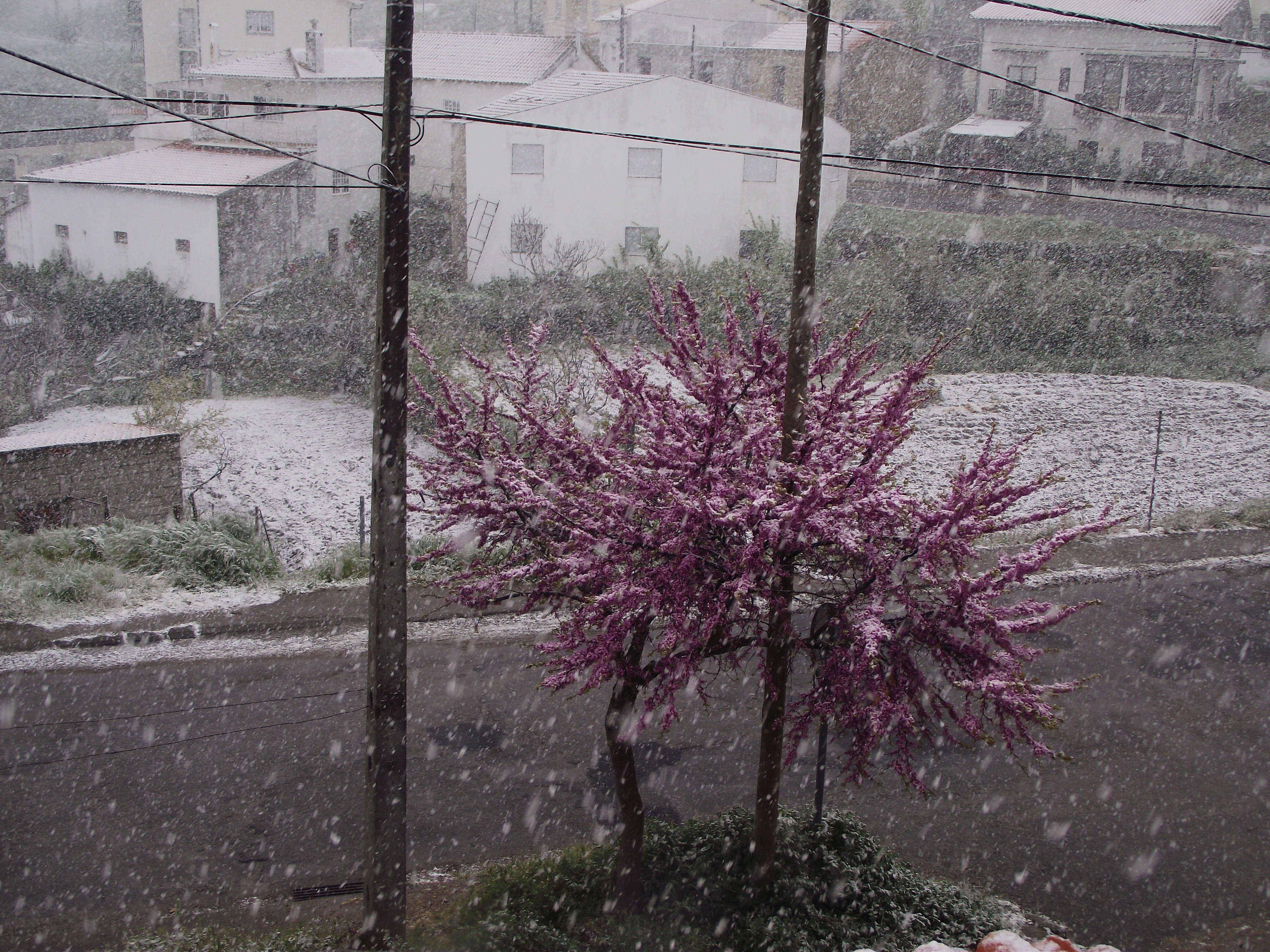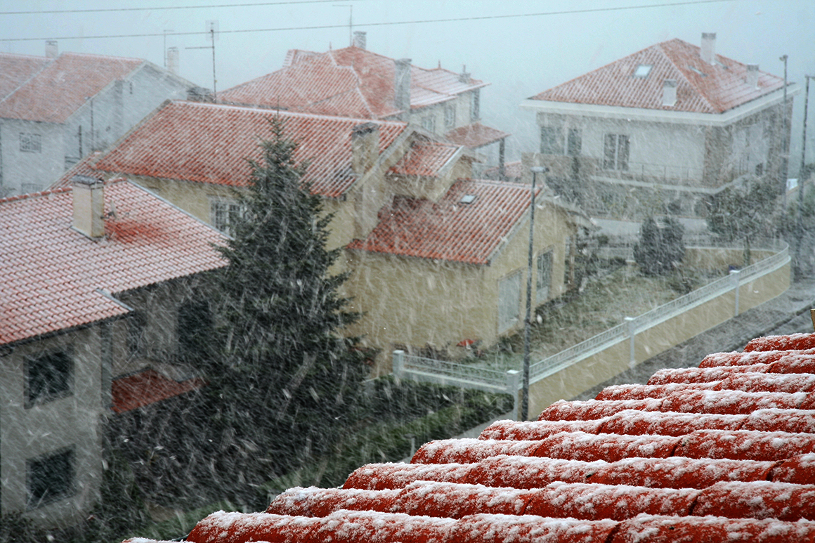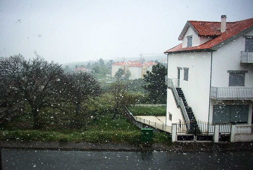 Apesar de a neve ainda não ter pegado nas estradas, pelas 10h40, após uma queda mais intensa, os flocos “pintavam” de branco os telhados e as árvores.