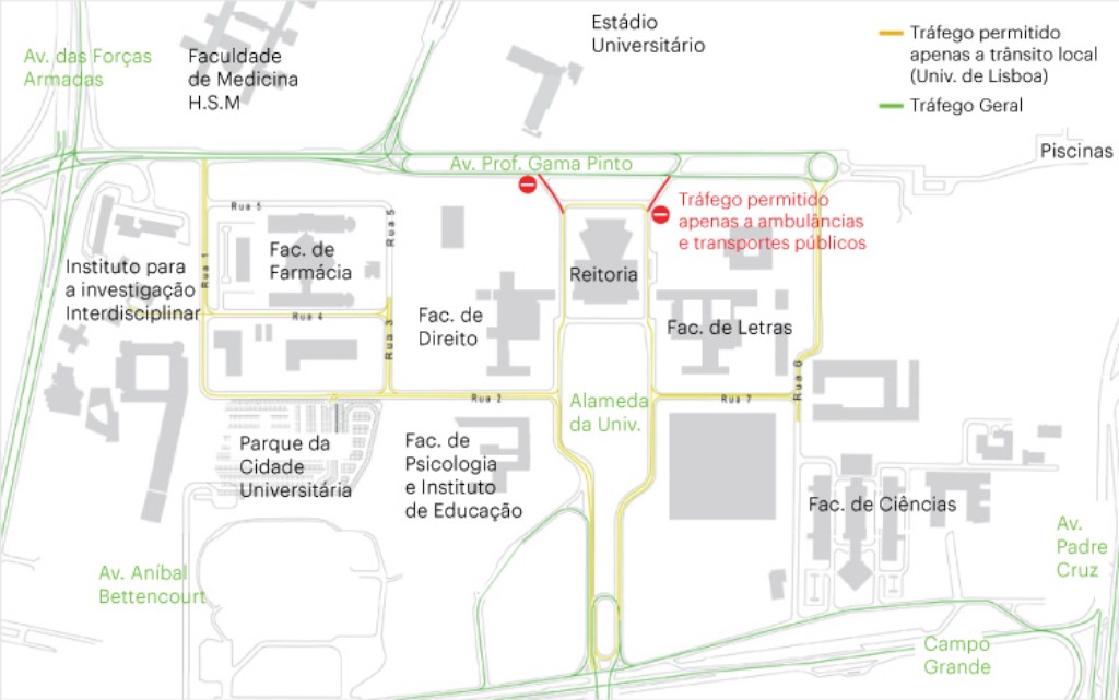 A circulação de veículos que não se deslocam para a UL passa a ser proibida dentro do Campus, estando permitida apenas a ambulâncias e a transportes públicos a passagem da Alameda para a Avenida Prof. Gama Pinto. Segundo David Xavier, serão colocados sinais verticais a impedir a circulação, não estando prevista a instalação de qualquer sistema de cancelas.