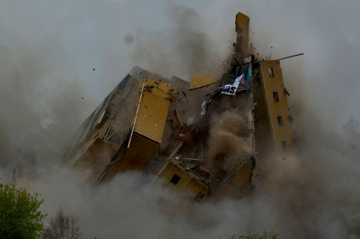 Correu tudo como estava previsto. A buzina de aviso soou duas vezes, uma voz nas colinas em redor fez uma contagem decrescente e gritou “Fogo”. Eram 11h13. Seguiu-se a explosão, aqueles instantes em que parece que tudo falhou, porque nada acontece, e, depois, a água subiu e a torre 4 tombou, partida a meio, no local onde era previsto cair.