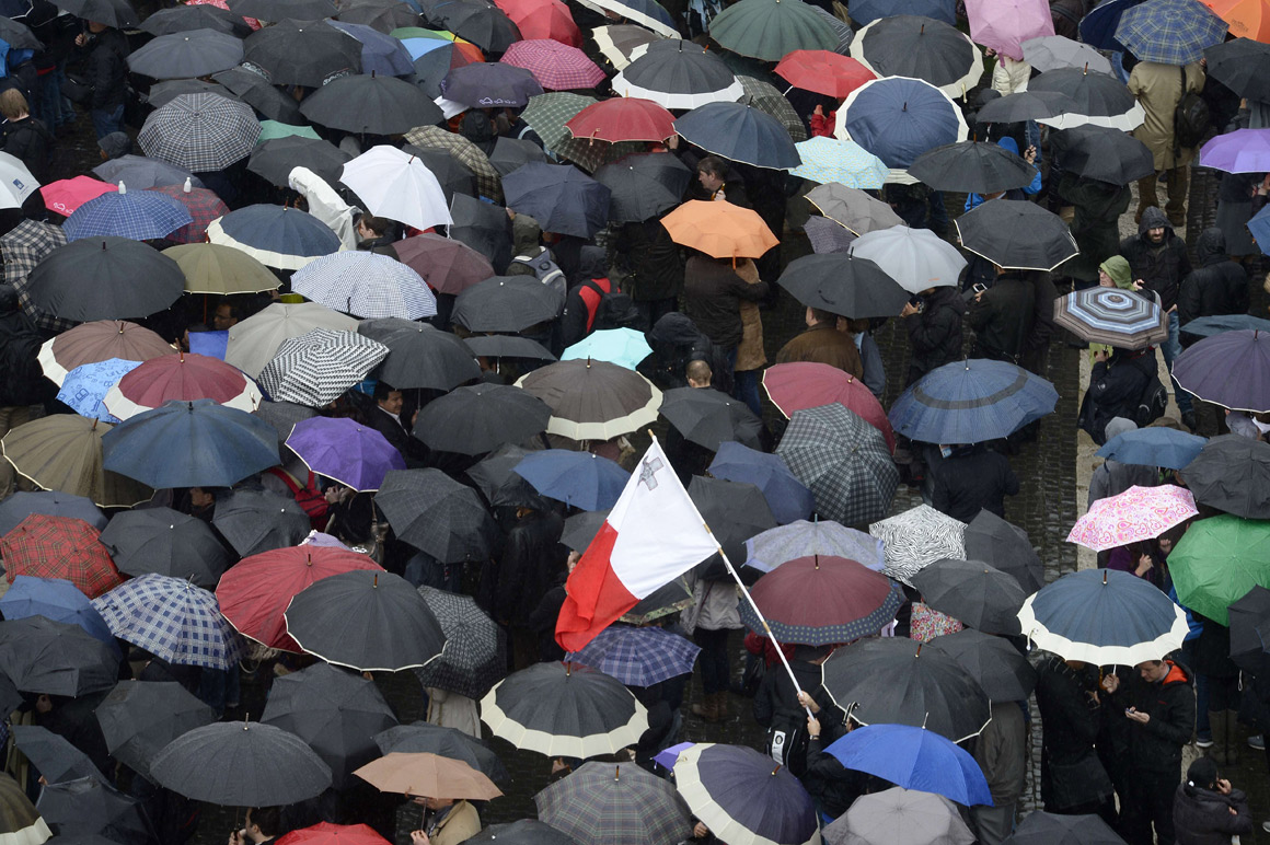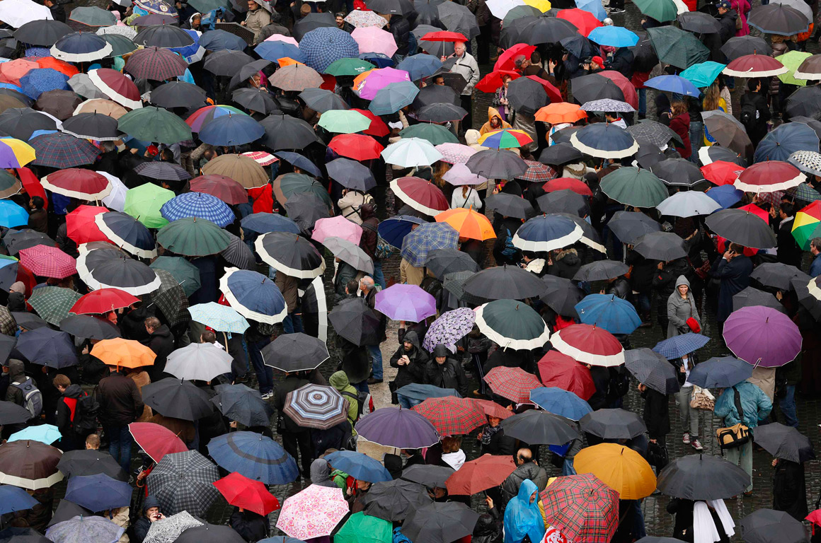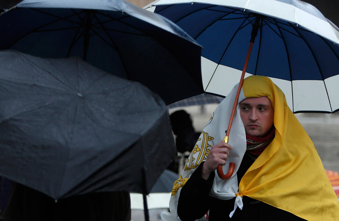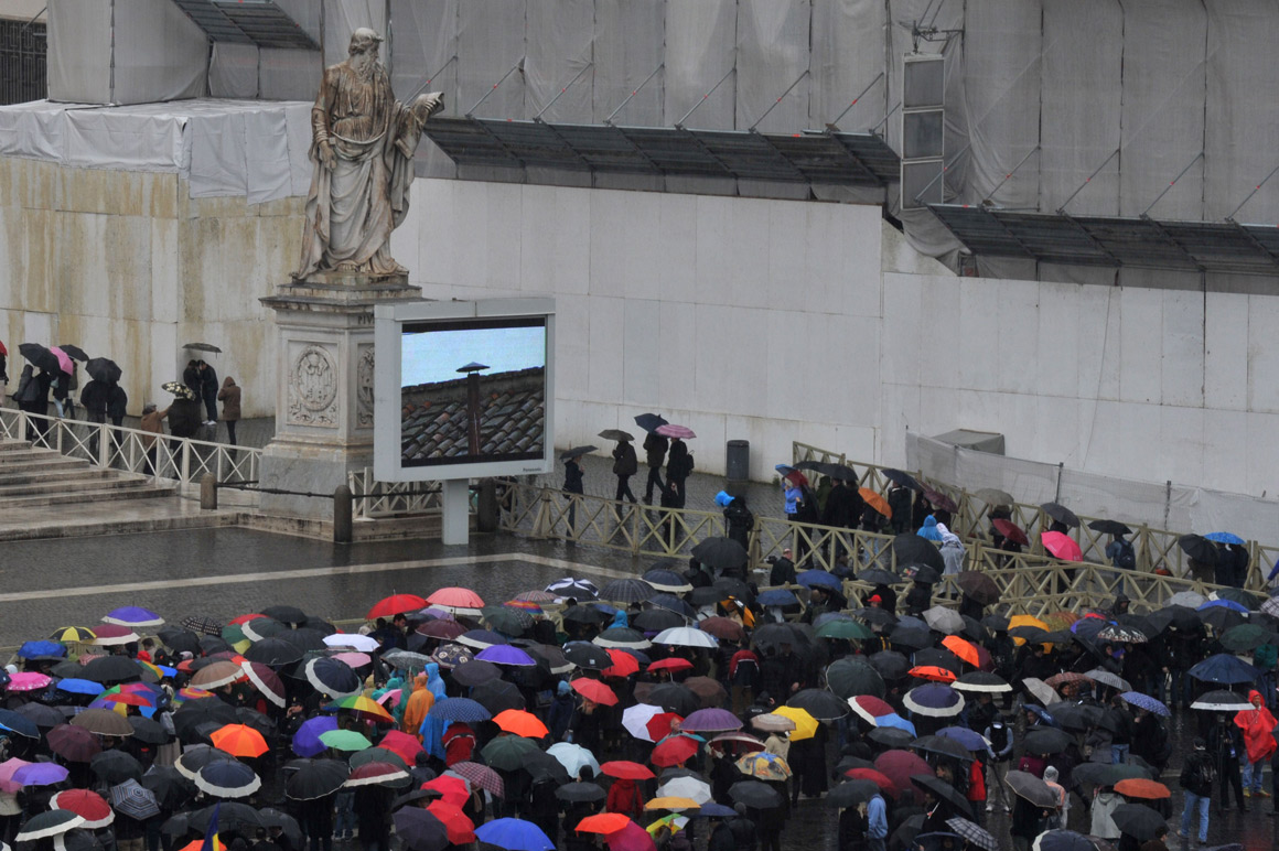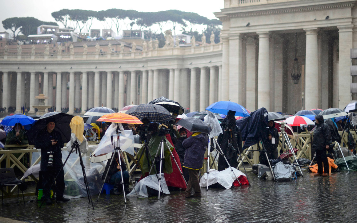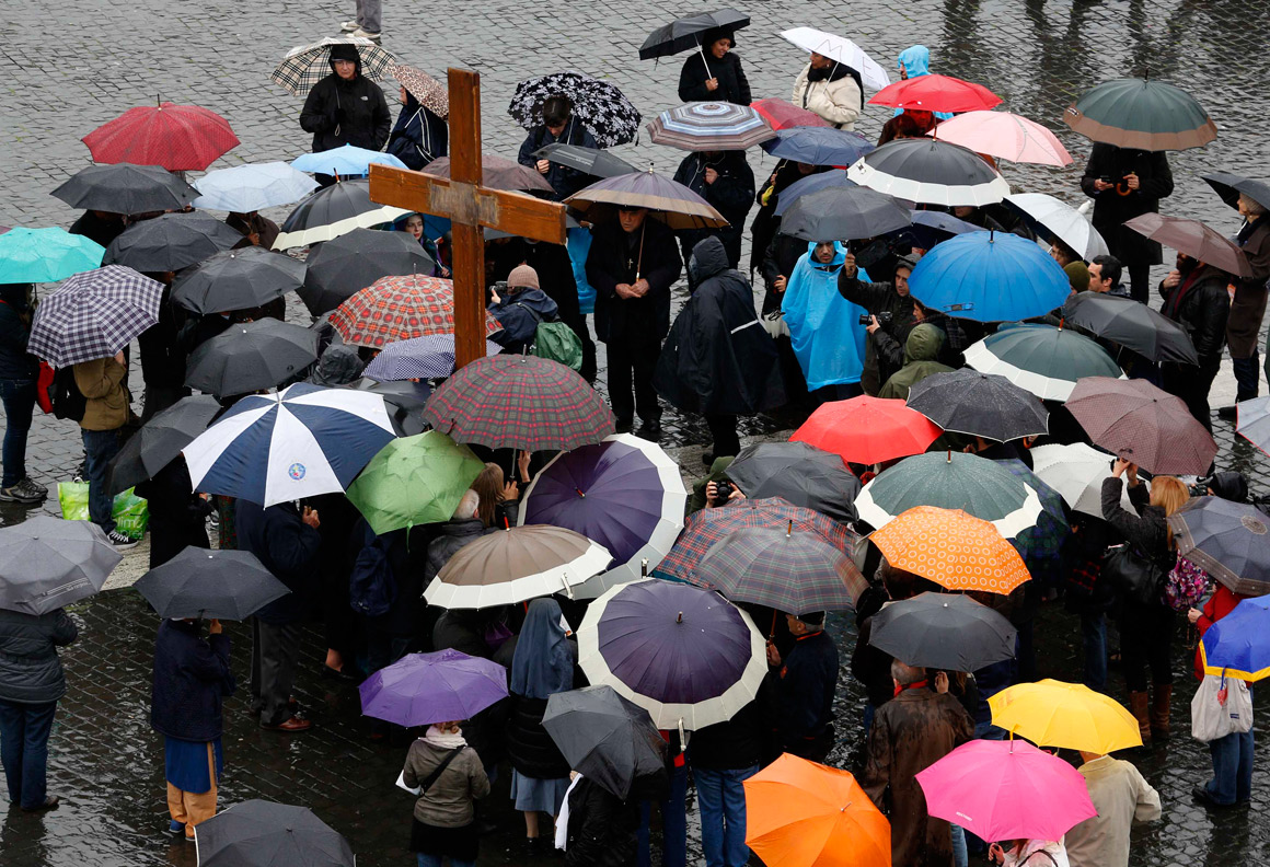 Antes do fumo branco e de Jorge Maria Bergoglio ter escolhido o nome Francisco, o dia no Vaticano ficou marcado pela chuva e pelos actos de fé. As máquinas fotográficas registaram muitos guarda-chuvas e rosários nas mãos dos peregrinos.