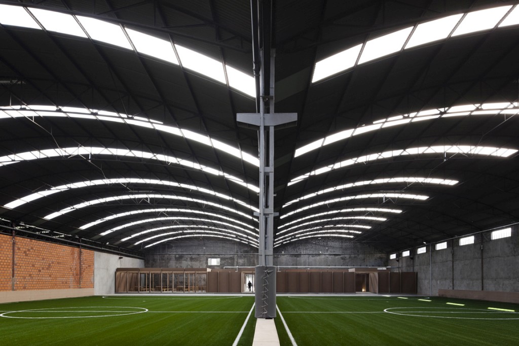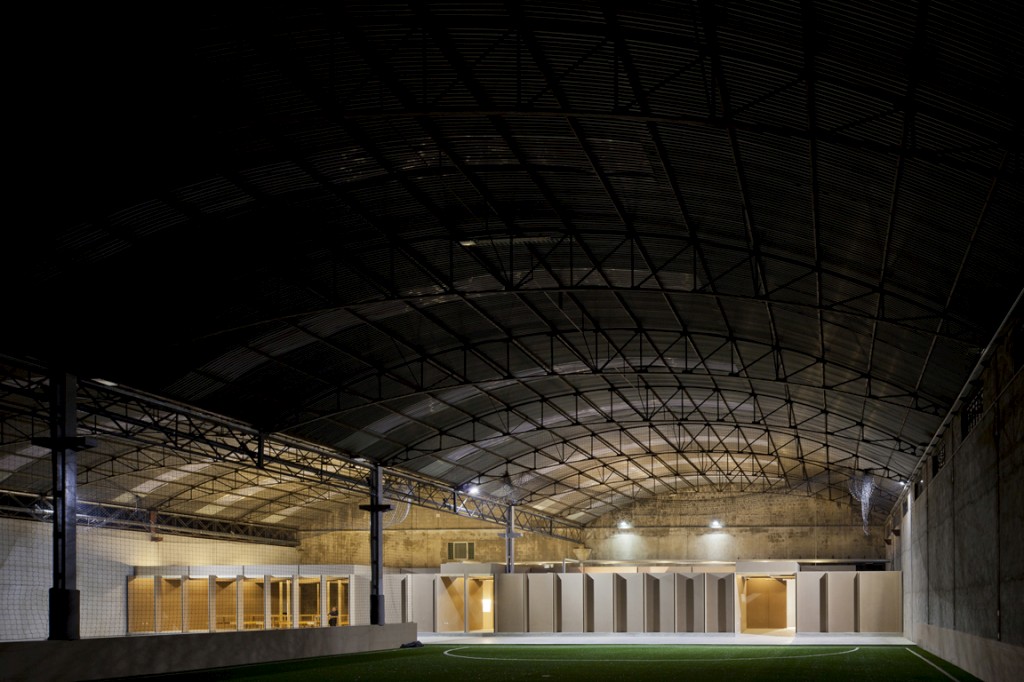 O que antes era um armazém degradado é agora um novo recinto desportivo. A inteligência construtiva dos arquitectos COMOCO, um jovem atelier de Coimbra, conseguiu, com preços mínimos, dar forma a um equipamento de apoio que permitiu instalar dois campos de relva sintética, zona de festas, balneários e recepção.