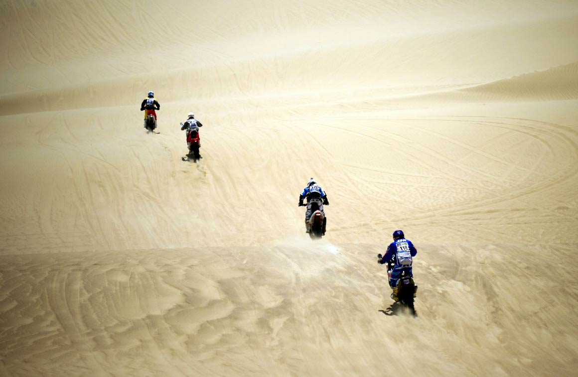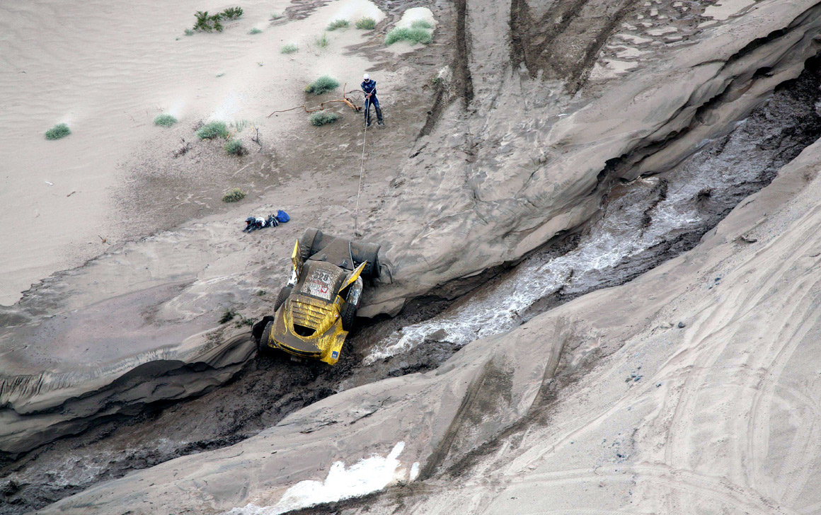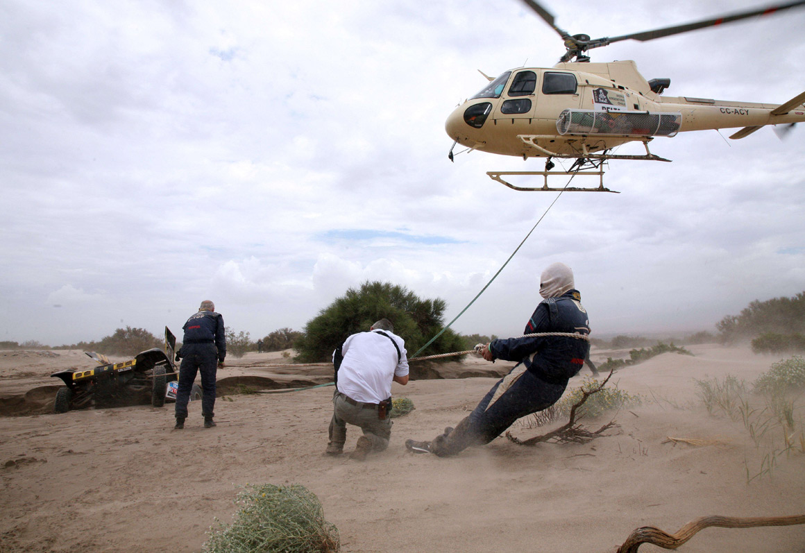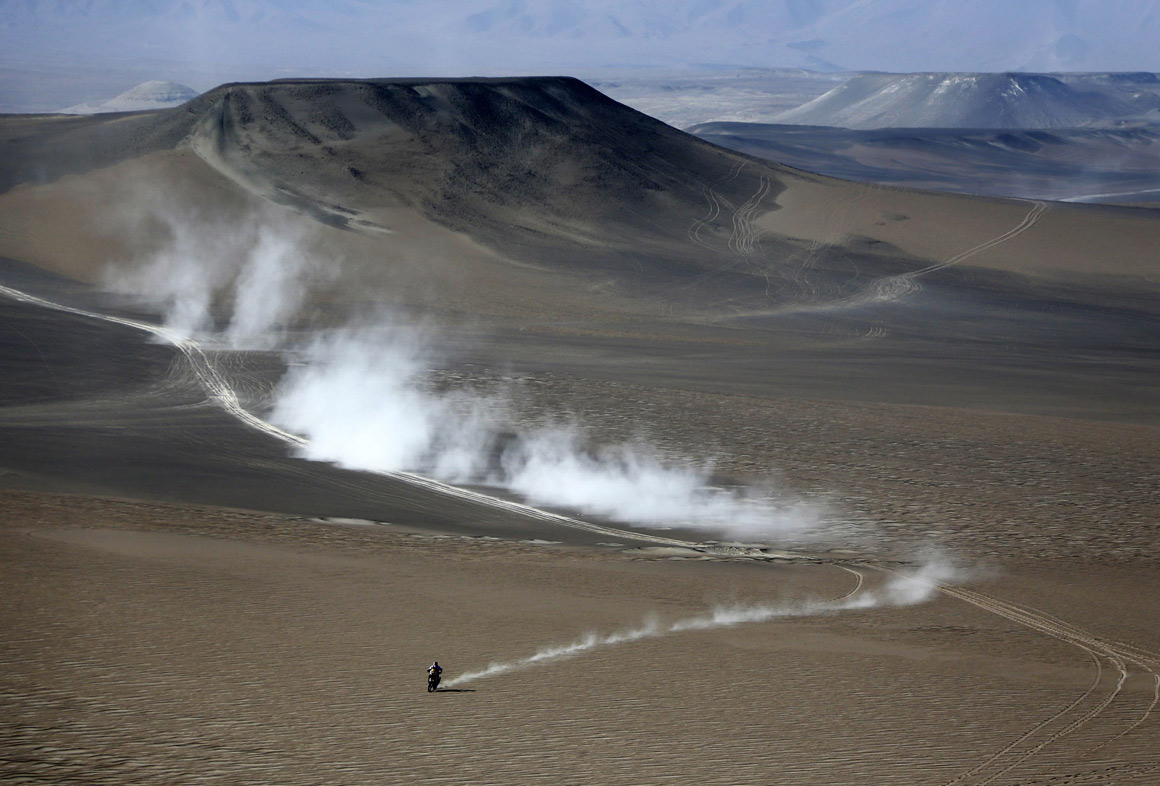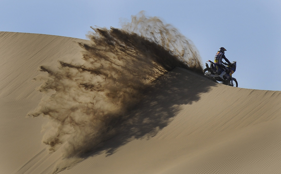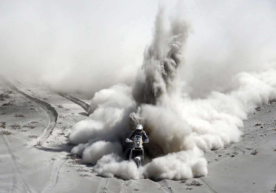 O sul-africano Riaan Van Niekerk Marcas na areia durante a primeira etapa da prova Motards na etapa entre Lima e Pisco, no Peru Um motard na etapa entre Pisco e Nazca, no Peru Um dos pilotos da Mini na etapa entre Nazca e Arequipa, no Peru O francês David Casteu cria uma nuvem de pó O salvadorenho Jorge Aguilar entre Salta e Tucuman, na Argentina Um helicóptero entre Tucuman e Cordoba, na Argentina O sul-africano Giniel de Villiers numa etapa na Argentina Cavalos na etapa entre Tucuman e Cordoba, na Argentina O australiano Juan Carlos Salvatierra Cordoba e La Rioja, na Argentina O argentino Orlando Terranova no meio da floresta do seu país Um concorrente num quad O francês Thomasse tenta tirar o seu buggy de um ribeiro O americano Robby Gordon nas dunas entre a Argentinas e o Chile Roby Gordon duna abaixo, rumo a Copiapo, no Chile O checo Loprais no seu camião O holandês Gerard De Rooy e a vertigem do buraco nas dunas Pascal Thomasse é ajudado pelo director de corrida O português Ruben Faria, que acabou num histórico segundo lugar O qatari Nasser Al-Attiyah Cyril Despres, o vencedor da prova, na categoria de motos Um carro e as montanhas chilenas