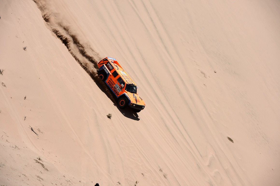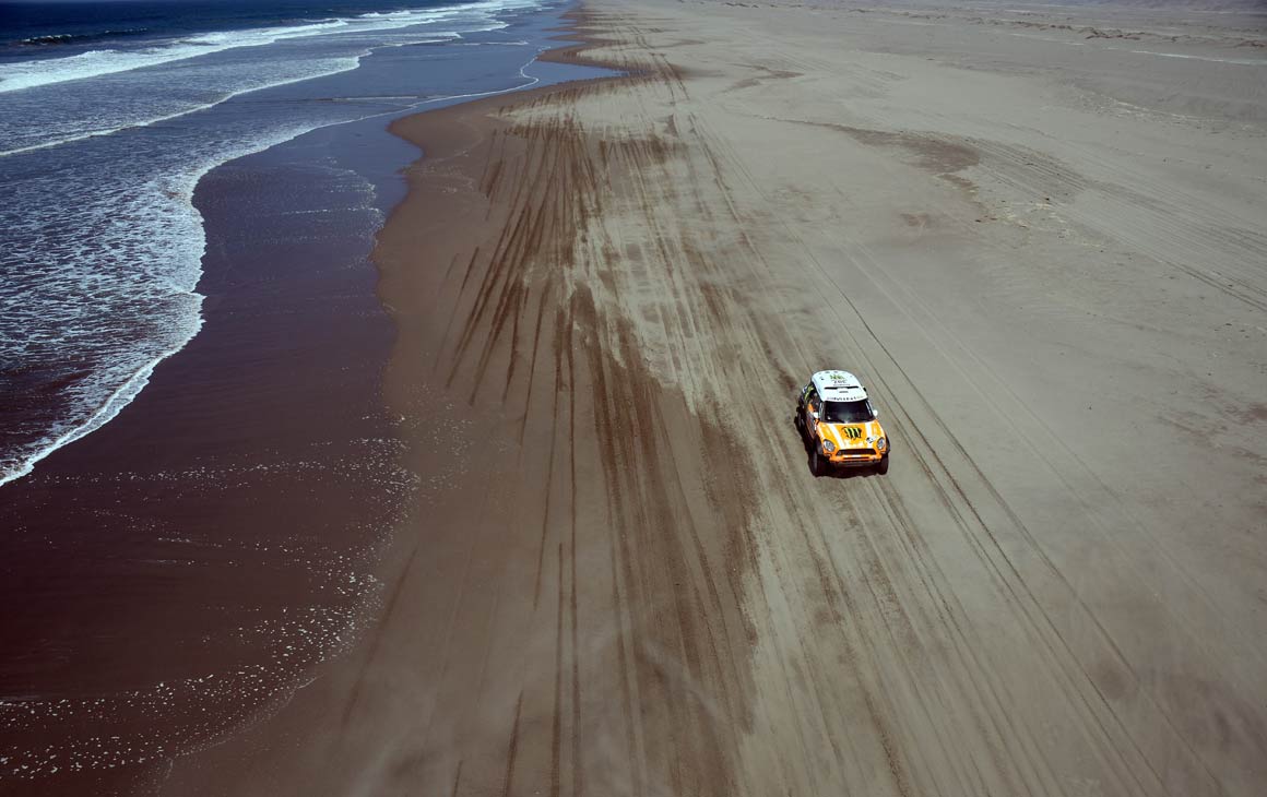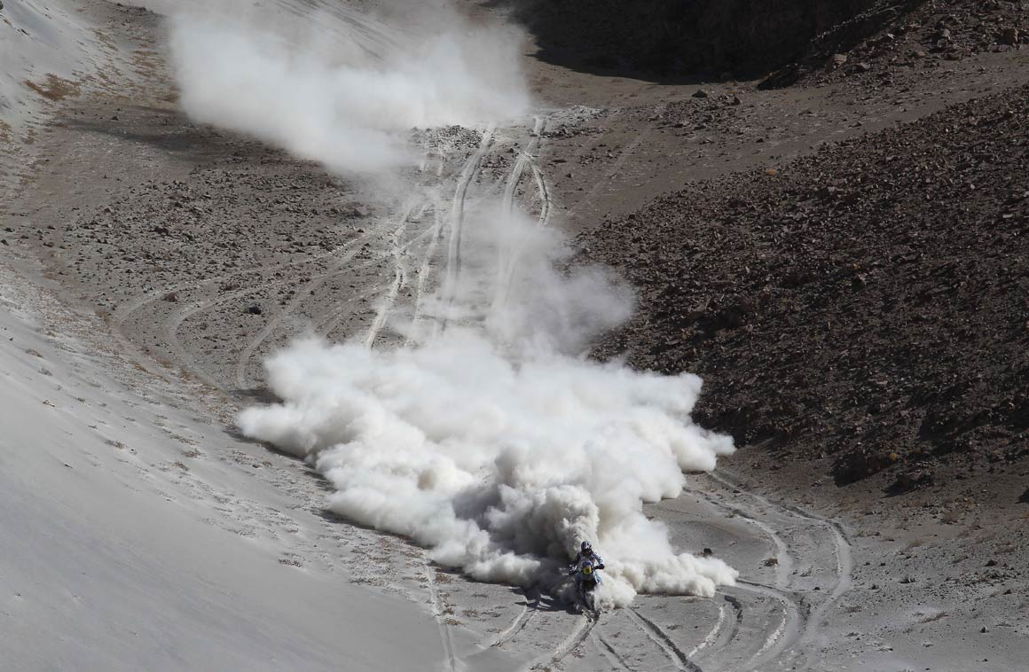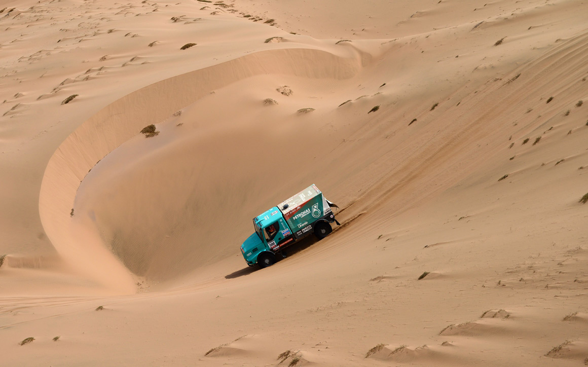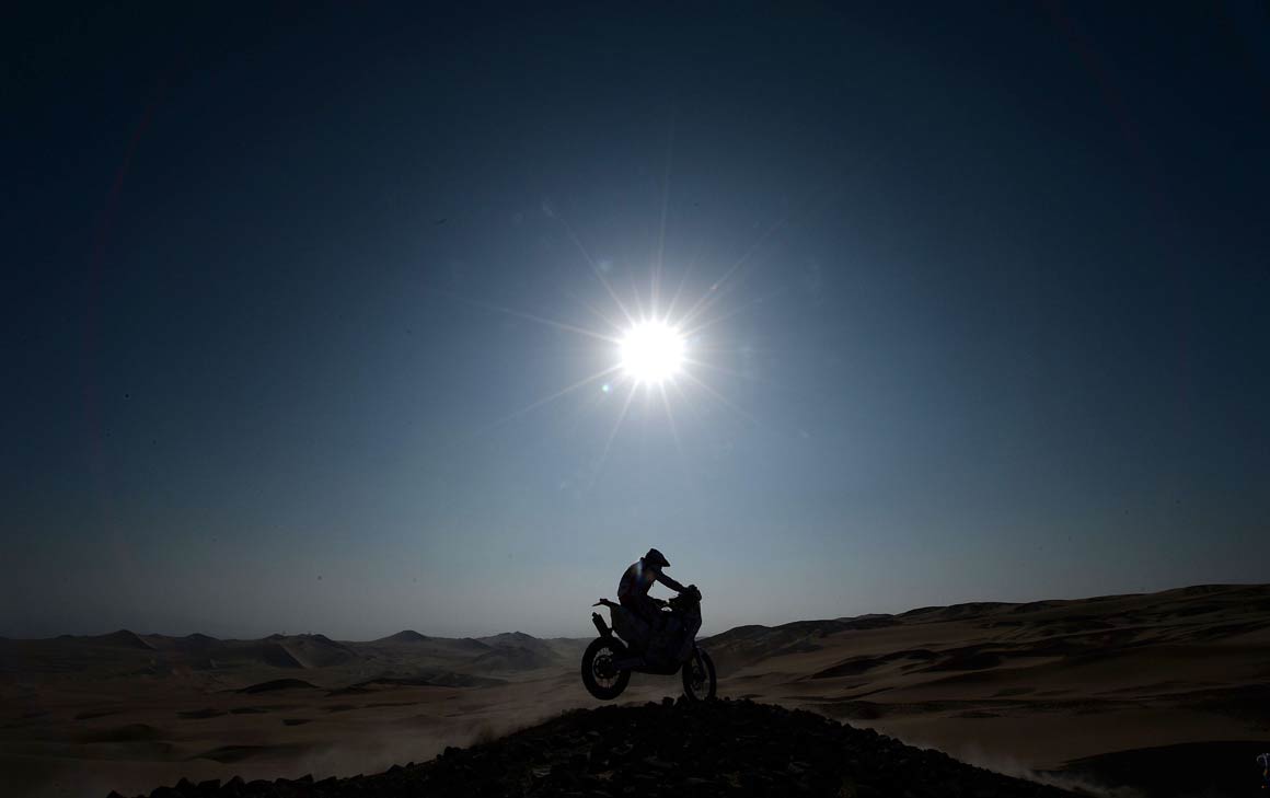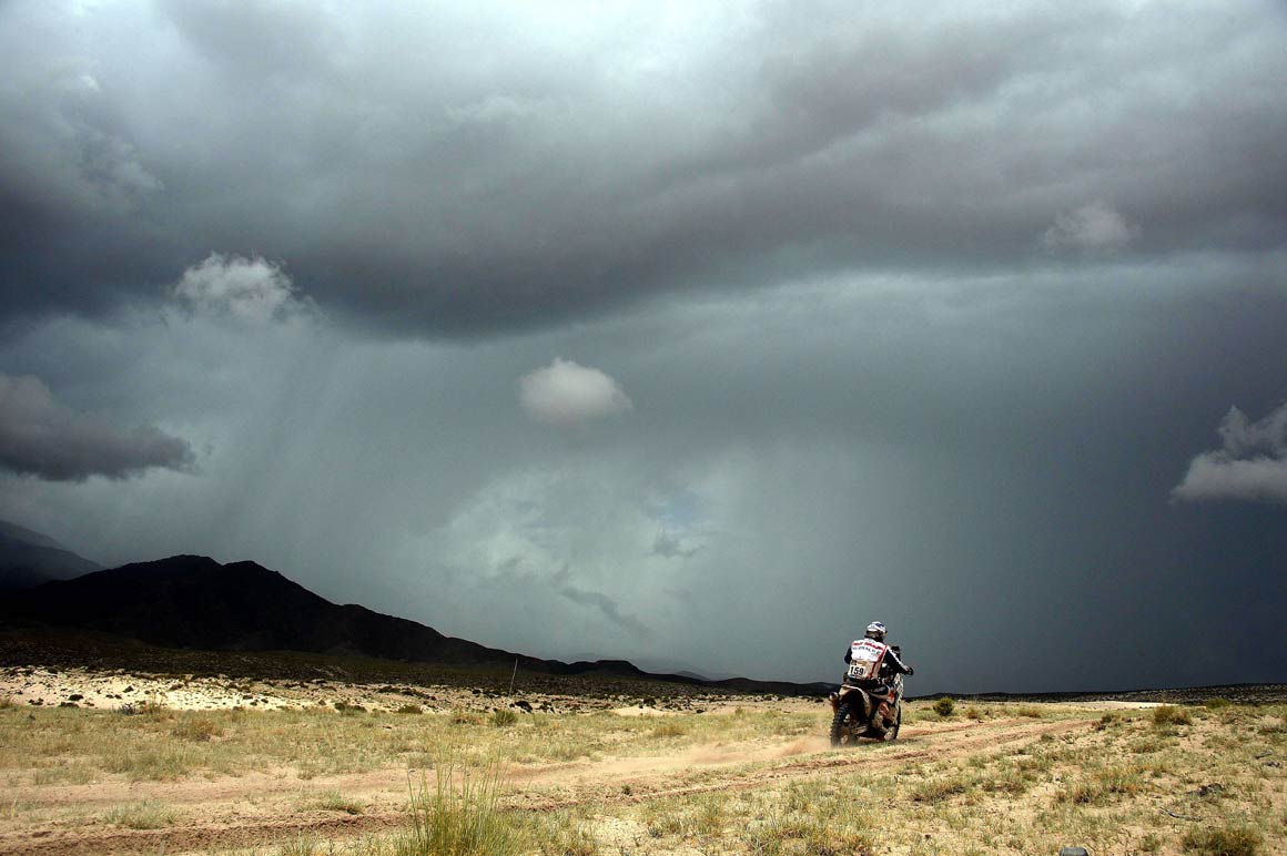 O sul-africano Riaan Van Niekerk Marcas na areia durante a primeira etapa da prova Motards na etapa entre Lima e Pisco, no Peru Um motard na etapa entre Pisco e Nazca, no Peru Um dos pilotos da Mini na etapa entre Nazca e Arequipa, no Peru O francês David Casteu cria uma nuvem de pó O salvadorenho Jorge Aguilar entre Salta e Tucuman, na Argentina Um helicóptero entre Tucuman e Cordoba, na Argentina O sul-africano Giniel de Villiers numa etapa na Argentina Cavalos na etapa entre Tucuman e Cordoba, na Argentina O australiano Juan Carlos Salvatierra Cordoba e La Rioja, na Argentina O argentino Orlando Terranova no meio da floresta do seu país Um concorrente num quad O francês Thomasse tenta tirar o seu buggy de um ribeiro O americano Robby Gordon nas dunas entre a Argentinas e o Chile Roby Gordon duna abaixo, rumo a Copiapo, no Chile O checo Loprais no seu camião O holandês Gerard De Rooy e a vertigem do buraco nas dunas Pascal Thomasse é ajudado pelo director de corrida O português Ruben Faria, que acabou num histórico segundo lugar O qatari Nasser Al-Attiyah Cyril Despres, o vencedor da prova, na categoria de motos Um carro e as montanhas chilenas