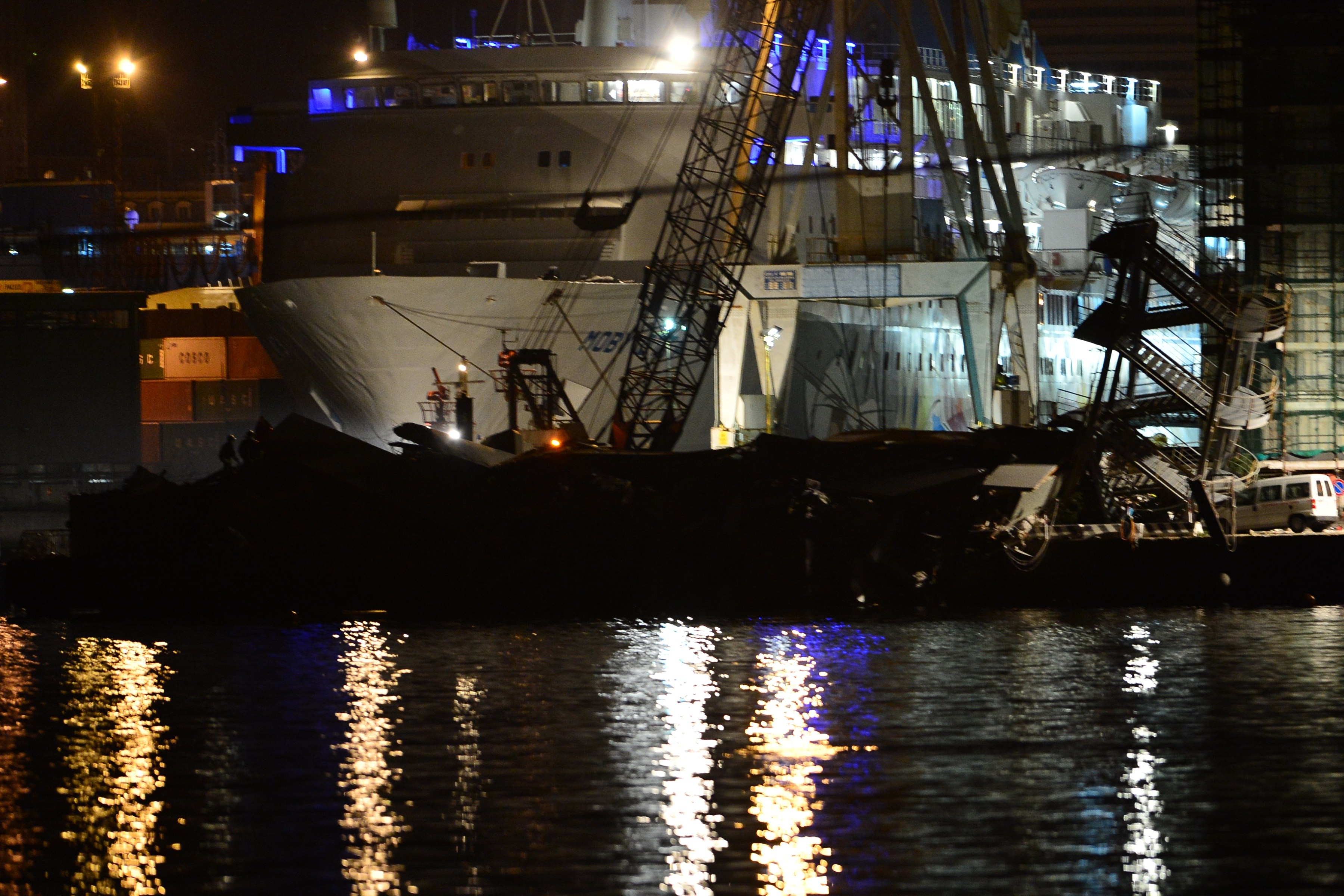 O barco com cerca de 240 metros de comprimento e mais de 40 mil toneladas terá colidido perto da meia-noite com a torre de controlo. Até ao momento não foi possível apurar se o embate teve origem num erro humano ou numa falha técnica, descreve a AFP, que explica que o facto de as primeiras manobras de socorro terem decorrido de noite está a dificultar as operações e balanços mais fidedignos. Os mergulhadores têm procurado sobreviventes tanto na bacia daquela área como na parte da torre que ruiu.