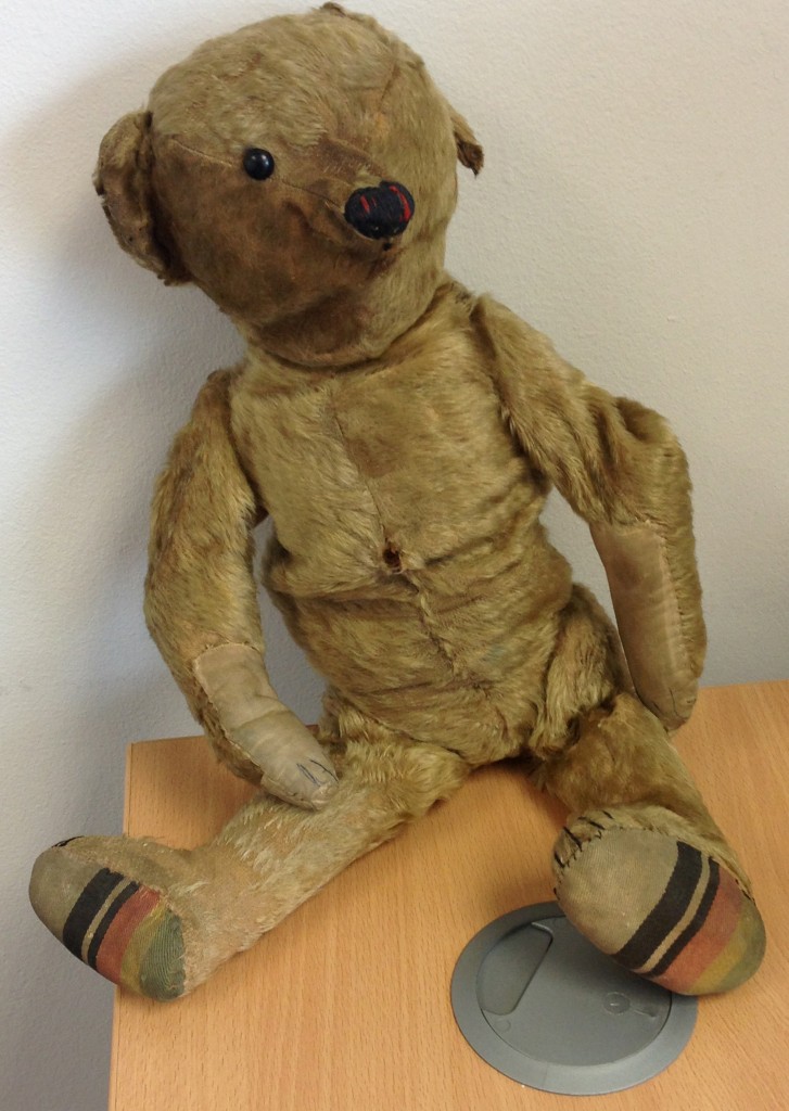 É uma antiguidade com quase cem anos: um urso de peluche zarolho e com uma orelha caída, acompanhado de um retrato a preto e branco de duas crianças com uma carinhosa mensagem para o pai – “Com amor e beijos para o nosso querido pai da sua filha e filhinho Dora e Glyn” – e a indicação – “Tirada a 14 de Março de 1918 no aniversário do ano e cinco meses do bebé”.