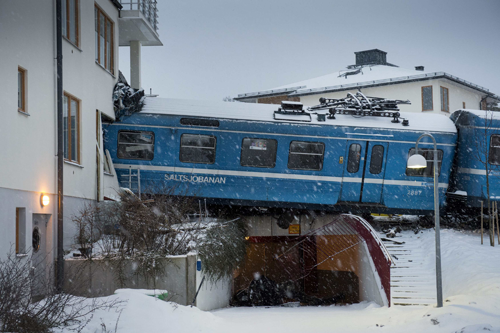 Uma mulher, com cerca de 20 anos, roubou um comboio sem passageiros e conduziu-o até que a composição saísse da linha e embatesse contra um prédio de habitação em Saltsjobaden, nos subúrbios de Estocolmo, Suécia. Apenas a jovem ficou ferida.