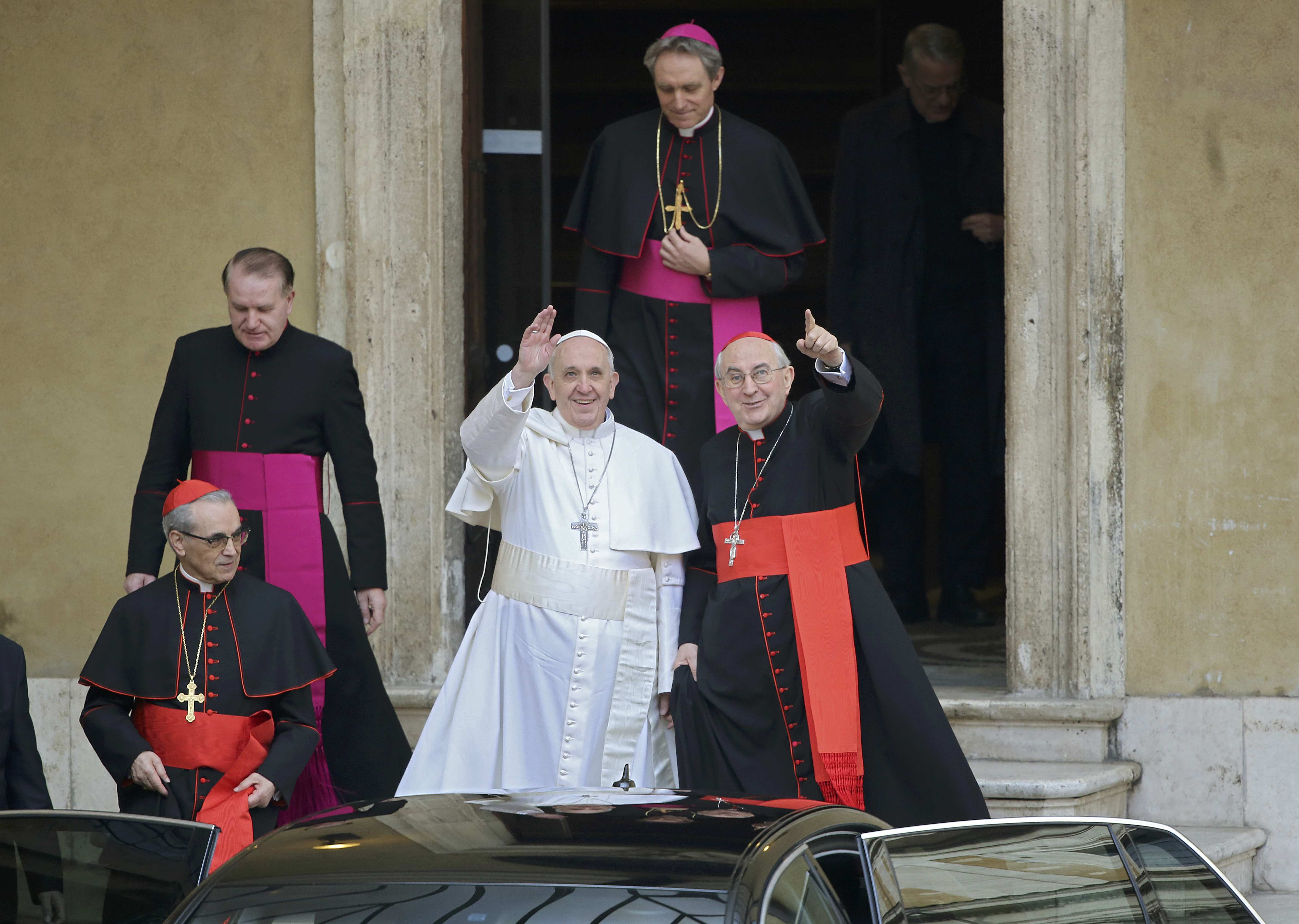 Francisco chegou com uma pequena comitiva de dois carros de serviço do Vaticano, acompanhado, entre outros, por Georg Gänswein, secretário particular do seu antecessor, Bento XVI, segundo um jornalista da agência AFP. Gänswein é também prefeito da casa pontifical. Viajou numa viatura sem a matrícula reservada aos pontífices, a CV1, o que confere com a imagem de modéstia que lhe é atribuída. Estavam à sua espera algumas dezenas de pessoas, principalmente jornalistas e e fotógrafos. À saída, saudou alunos que o saudavam das janelas de uma escola.