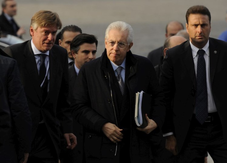 16 de Novembro: Monti obtém a confiança do Parlamento, com o apoio de uma maioria híbrida formada pela esquerda, a direita berlusconiana e do centro, e assume funções como chefe de Governo tendo por objectivo salvar a terceira economia da zona euro de uma possível falência. Compromete-se a fazer de Itália um “elemento de força” na Europa e exorta os italianos a fazerem “um esforço conjunto” para sair da crise da dívida.