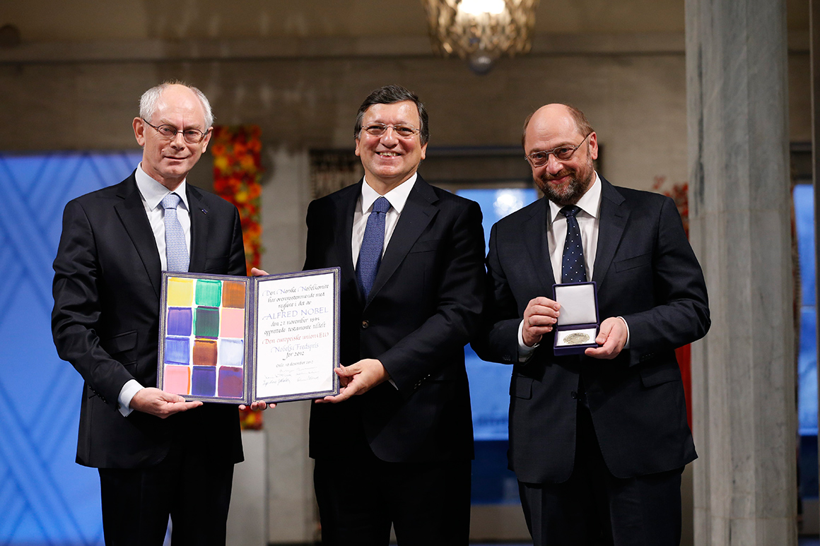 O prémio Nobel da Paz foi na tarde desta segunda-feira formalmente entregue à União Europeia (UE) numa cerimónia solene em Oslo em que Heródoto, Espinosa e Abraham Lincoln foram citados para celebrar o génio e a audácia que marcaram a concepção do maior projecto de paz da História.