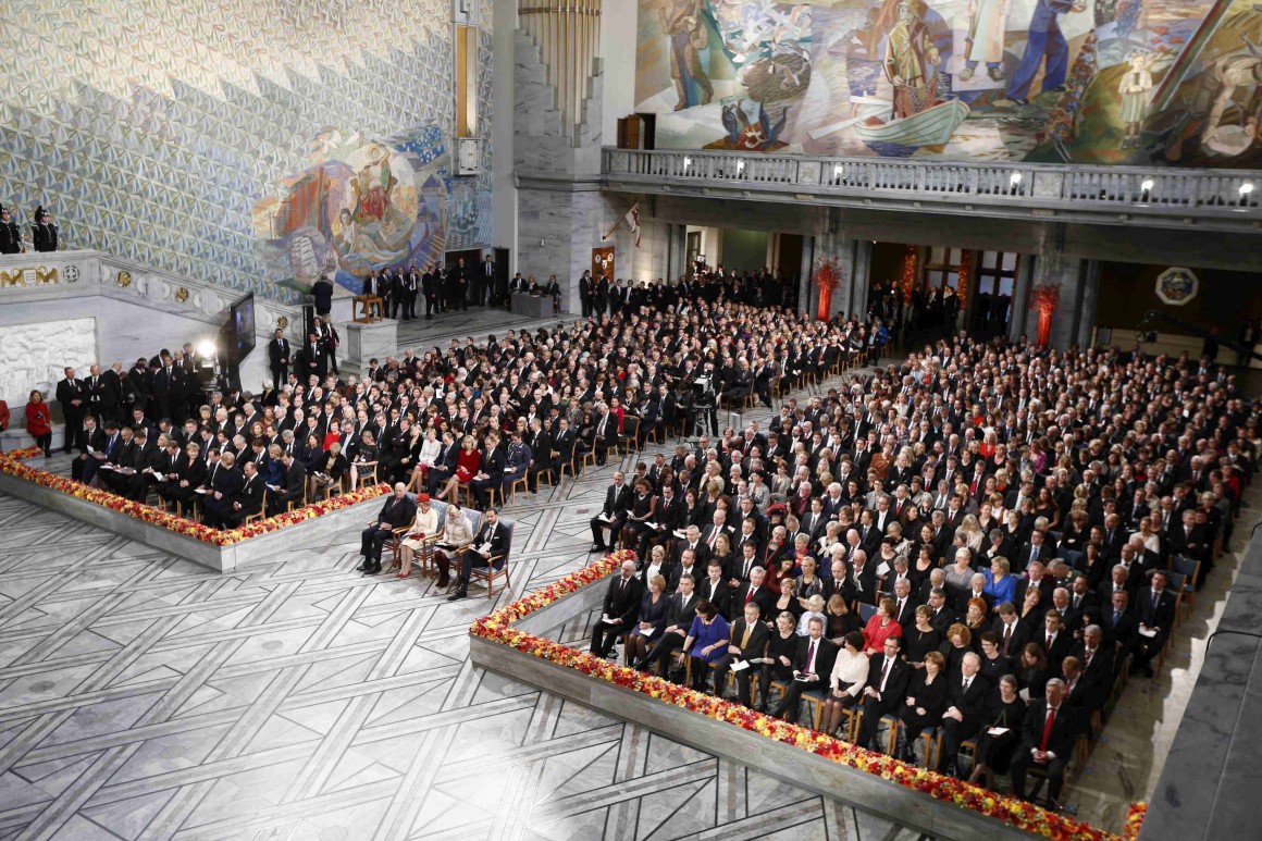 A presença de Angela Merkel, chanceler alemã, e François Hollande, Presidente francês, sentados lado a lado na primeira fila dos espectadores, "torna este dia muito simbólico para todos nós", afirmou Jagland, suscitando uma longa ovação na sala. Algumas ausências foram notadas: o primeiro-ministro David Cameron, por exemplo, fez-se representar pelo seu número dois, Nick Clegg.