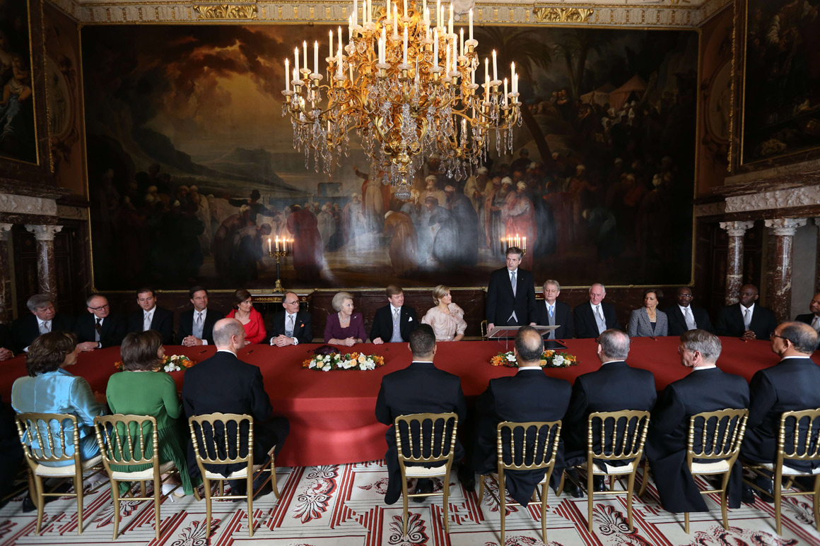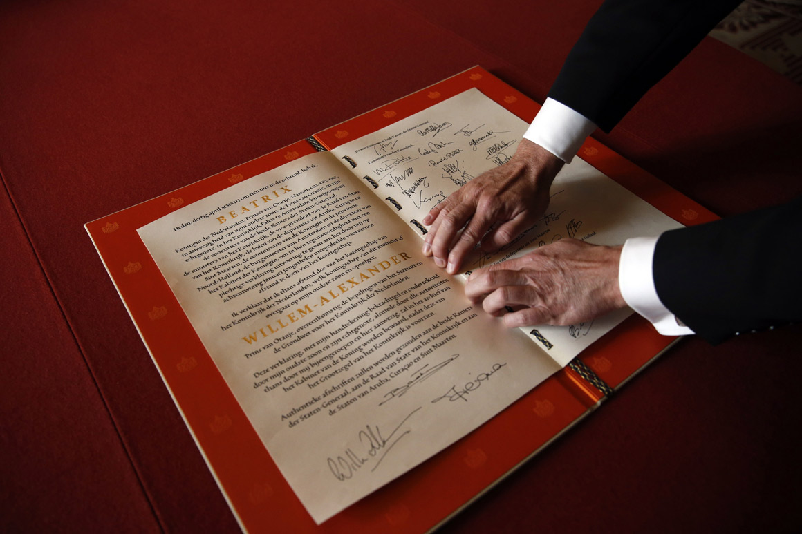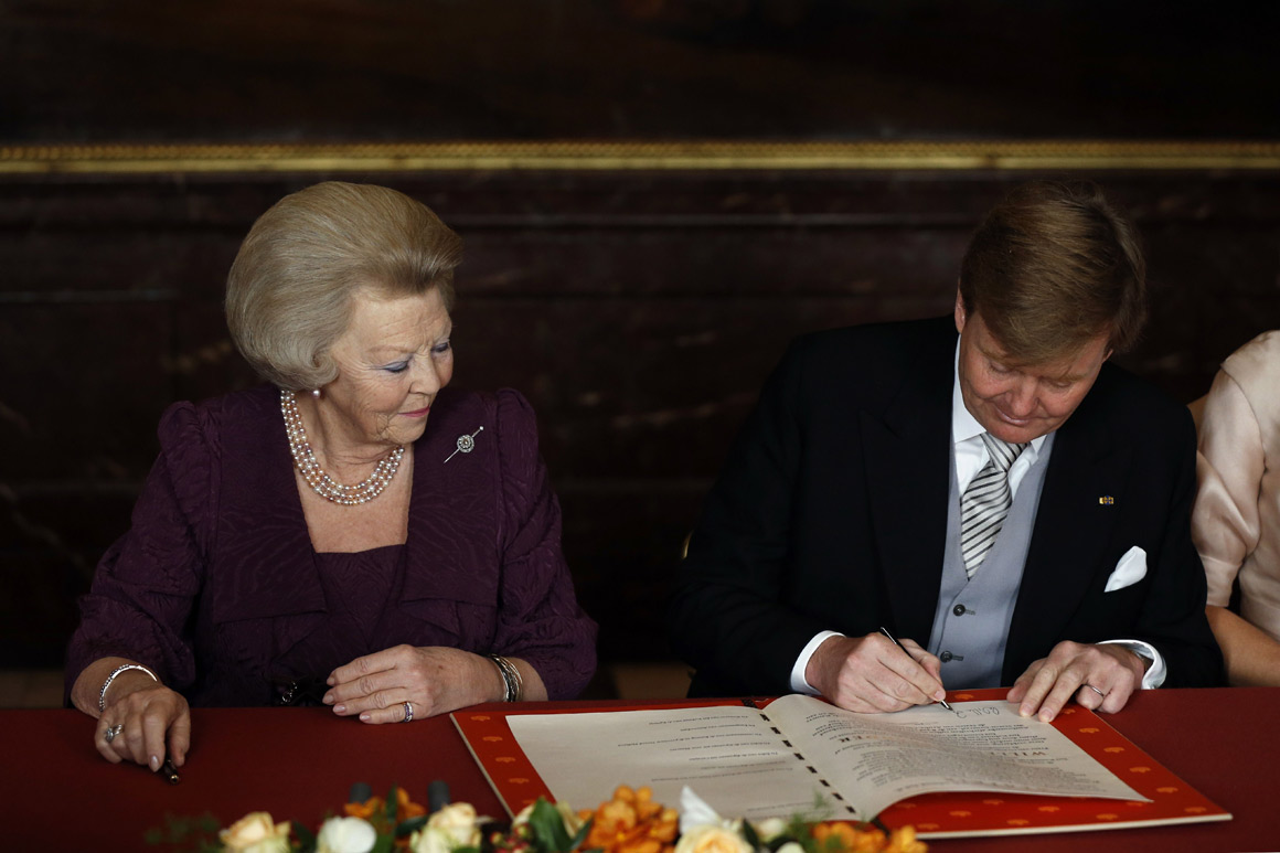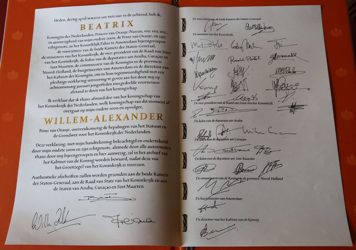 Para assinalar a assinatura da lei da abdicação, e para que o povo na praça soubesse que estava concluída, a bandeira foi descida e de novo hasteada. Willem seguiu para a varanda, onde fez um curto discurso, depois de Beatriz, a mãe e agora princesa, o apresentar como rei.