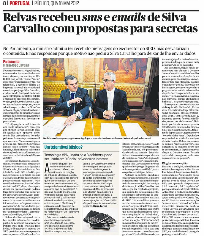 Na quarta-feira, 16 de Maio, publicámos na edição impressa uma notícia de Maria José Oliveira de página inteira com o título "Relvas recebeu sms e emails de Jorge Silva Carvalho com propostas para as secretas". O lead da notícia (que republicamos hoje) é sobre a contradição de Relvas tornada evidente na sua audição, na véspera, na Assembleia da República. Na semana anterior o ministro dissera não ter "ideia" de ter recebido sms e clippings de Jorge Silva Carvalho; agora, no Parlamento, Relvas dissera que sim, que recebera sms e clippings de Silva Carvalho todos os dias.