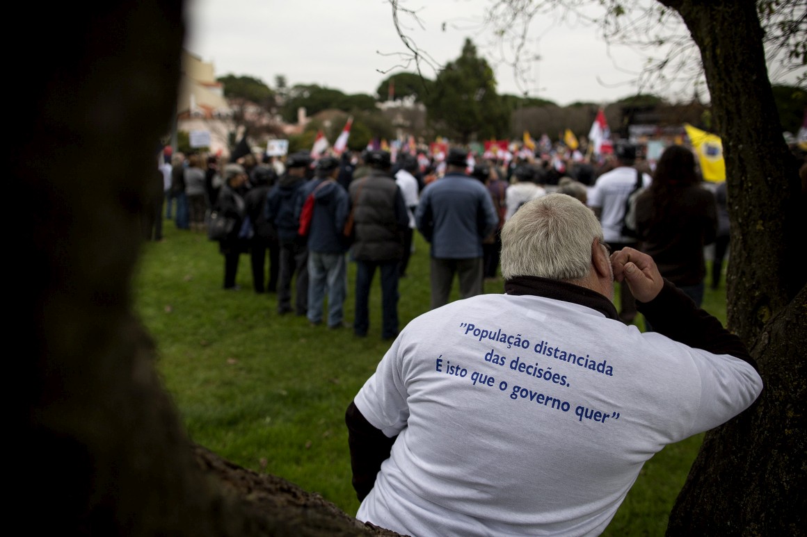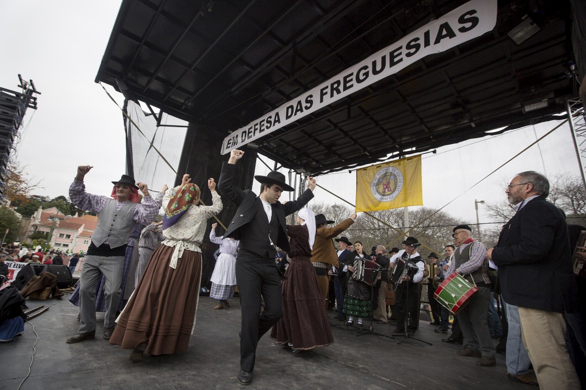 A concentração, convocada pela Associação Nacional de Freguesias, começou por volta das 14h00 com o objectivo de protestar contra o actual projecto de lei da Reorganização Administrativa do Território das Freguesias, que agrega 1160 daqueles órgãos.