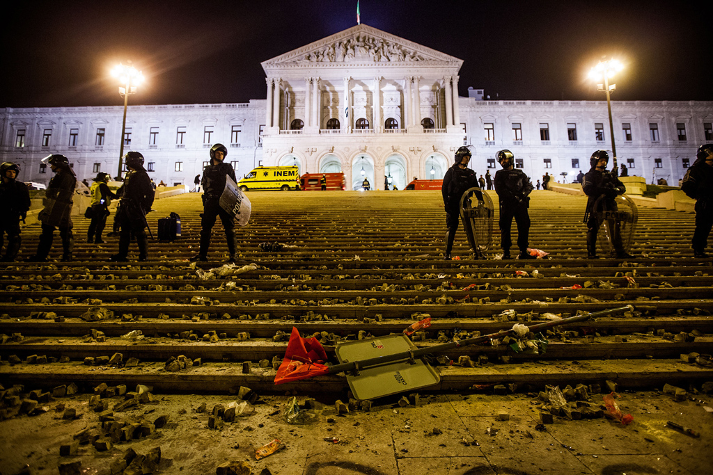A 14 de Novembro, dia de greve geral e no final de uma manifestação convocada pela CGTP, dezenas de manifestantes apedrejaram a polícia, junto à Assembleia da República, e esta respondeu com uma carga policial.
