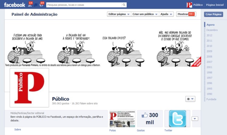 O PÚBLICO ultrapassou os 300 mil seguidores no Facebook. É um marco para esta comunidade que tem vindo a crescer gradualmente e para toda a comunicação social portuguesa presente naquela rede social, na qual a página principal do PÚBLICO tem a maior comunidade entre todas as páginas principais dos órgãos de informação portugueses.