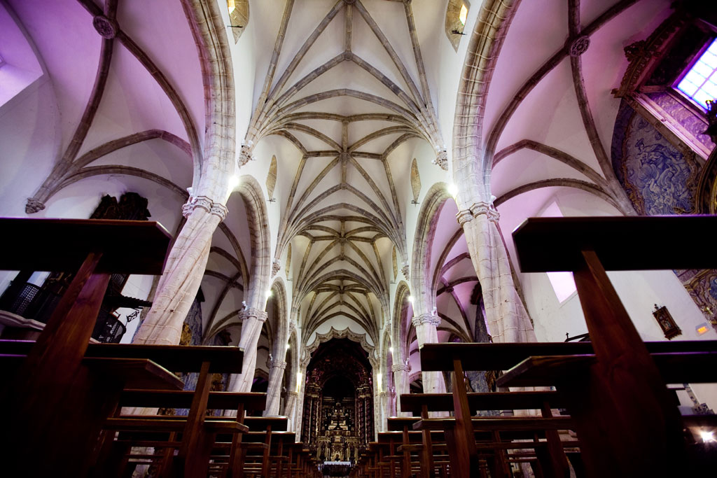 No exterior, destacam-se falsas ameias, pináculos, gárgulas e a porta principal, com uma portada atribuída a Nicolau de Chanterene, artista que em Portugal, além de outras obras, criou a porta do Mosteiro dos Jerónimos ou um retábulo de mármore do Palácio da Pena. O interior divide-se por três naves com oito colunas que parecem evocar as amarras de um navio. Em grande destaque, os trabalhos em talha dourada do séc. XVIII, retábulos neoclássicos em mármore colorido e azulejaria.