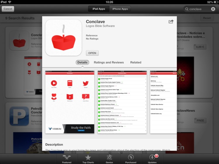 Se a pesquisa na App Store da Apple for feita por conclave, os resultados são mais modestos em número (12). E tanto num caso como no outro, nem todas as aplicações disponíveis estão efectivamente relacionadas com a eleição de um novo Papa.