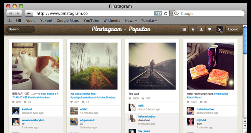 No Pinstagram, a interacção com as fotografias distribuídas em cascata na página dos utilizadores, depois de assinaladas como favoritas (como no Pinterest), é feita com “gostos” e comentários e partilhas (como no Instagram). “Este é a interface para Instagram perfeito para mim”, disse Pek Pongpaet, ao Mashable.