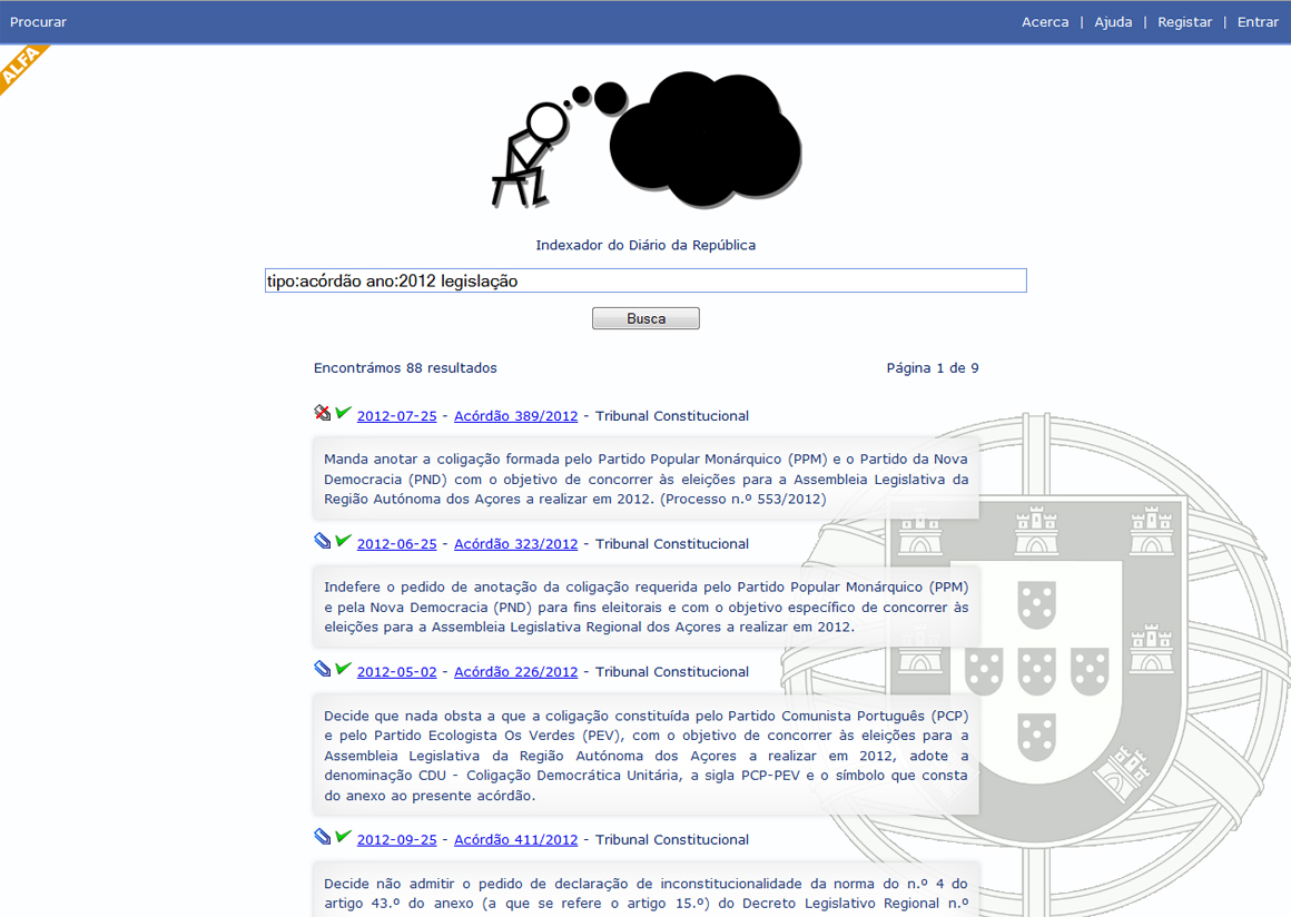 A qualidade do DRE é, na análise de Helder Guerreiro, “extremamente baixa”. O principal problema é o sistema de buscas que, diz na apresentação do seu Indexador do Diário da República, “para além de lento, é muito sensível às perguntas que lhe pomos”. “O sistema de buscas do DRE é alguma coisa que não existe. Se não soubermos o número do diploma, dificilmente o encontramos”, diz o activista ao PÚBLICO.