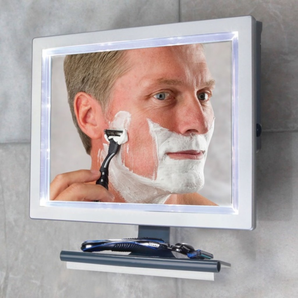 Hora do banho Fazer a barba em frente de um espelho embaciado é a rotina de muitos homens. Fica-se com a aparência de um figurante de filme de terror. Banho e barba ao mesmo tempo não funcionam mesmo. Ou melhor, não funcionavam. Agora existe um novo e melhor companheiro: é o The Best Fogless Lighted Mirror. Enquanto um espelho normal demora menos de cinco minutos a tornar-se inútil, este resiste até 20 minutos. Possui um recipiente de água quente que mantém o espelho à mesma temperatura da casa de banho. E é fácil de montar. Preço: 38€ www.hammacher.com