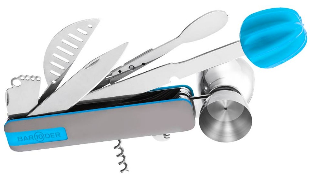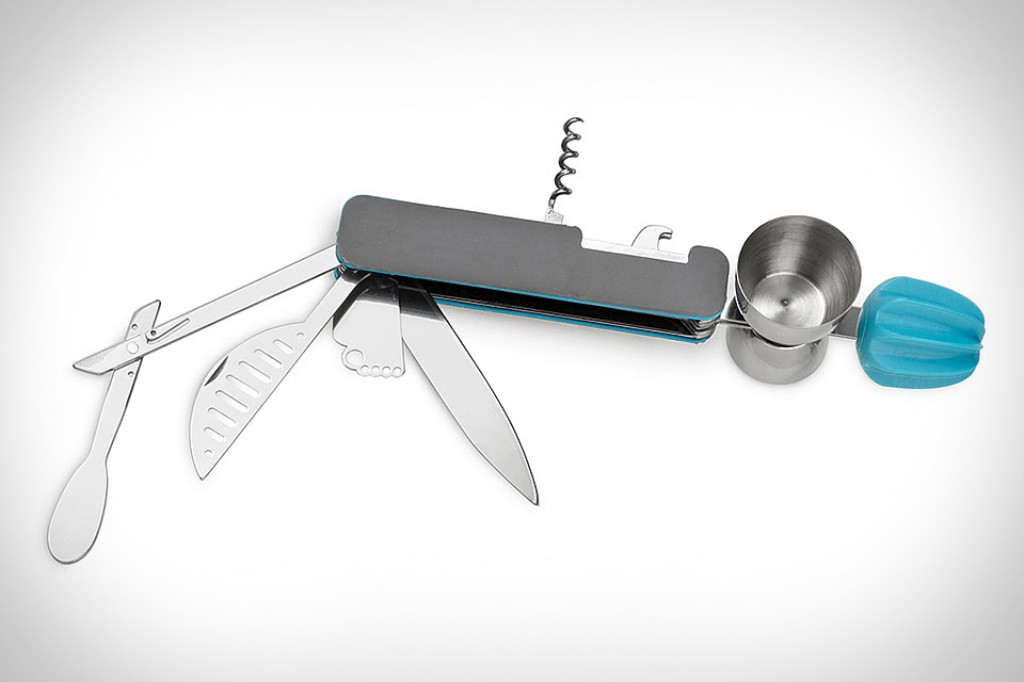 O canivete suíço melhorado É o sonho de todos os rapazes ter um canivete suíço com todas aquelas lâminas e ferramentas. Mas agora alguém fez uma coisa para os crescidos: um canivete com várias ferramentas, mas todas para usar na preparação de bebidas. Vai-se abrindo e encontra-se tudo o que se pode precisar para preparar o cocktail preferido: um doseador, um espremedor de frutas, um abridor de garrafas, um saca-rolhas. Tudo à mão. 37 €